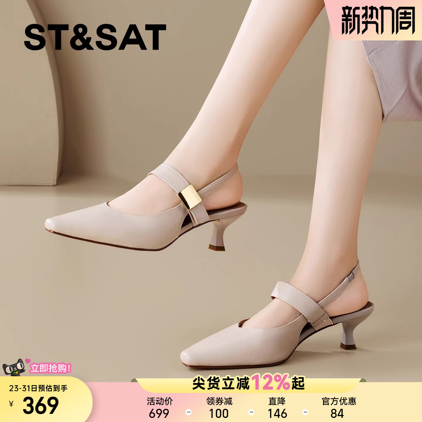 星期六通勤真皮一字带包头凉鞋女2026夏季新款方头细跟高跟鞋女鞋