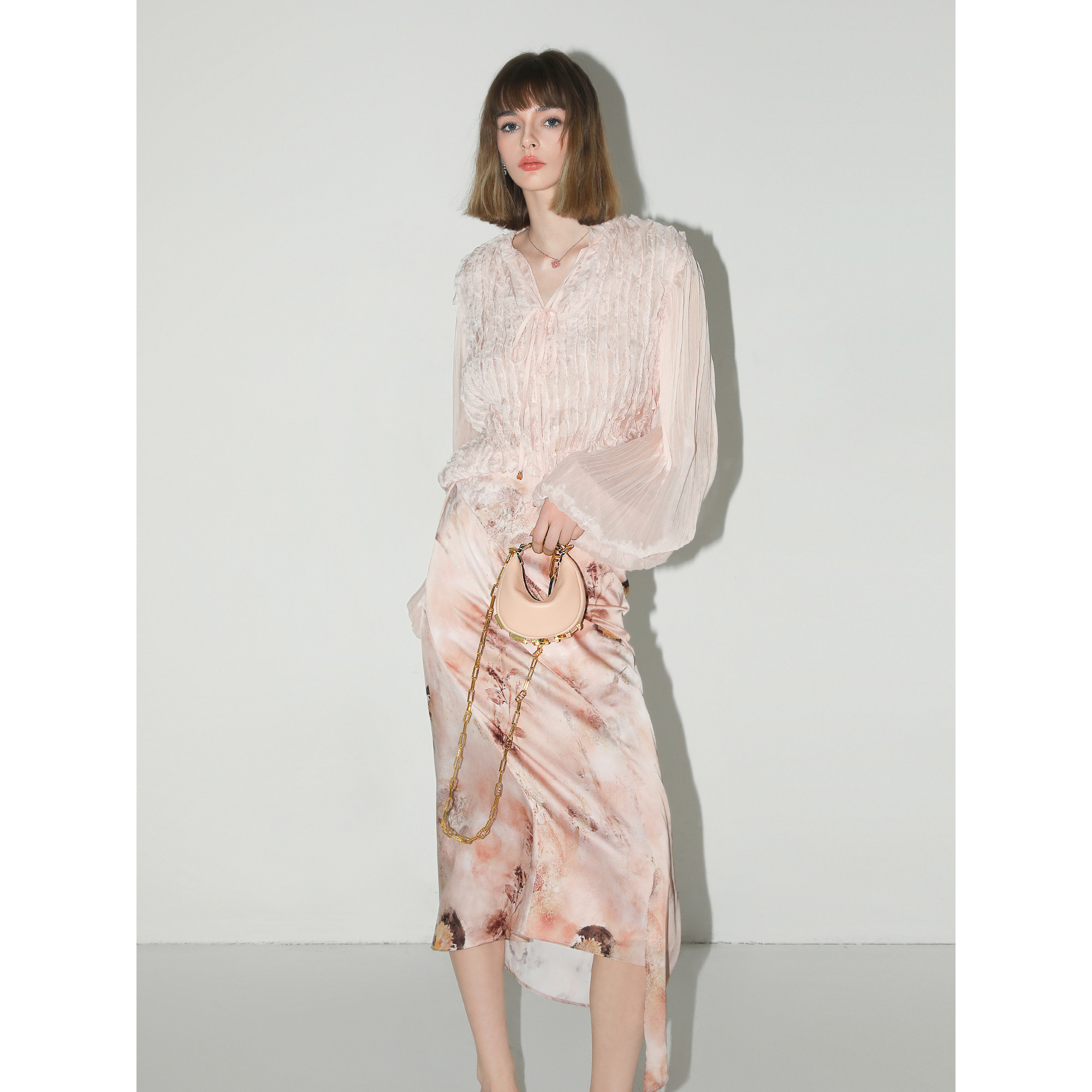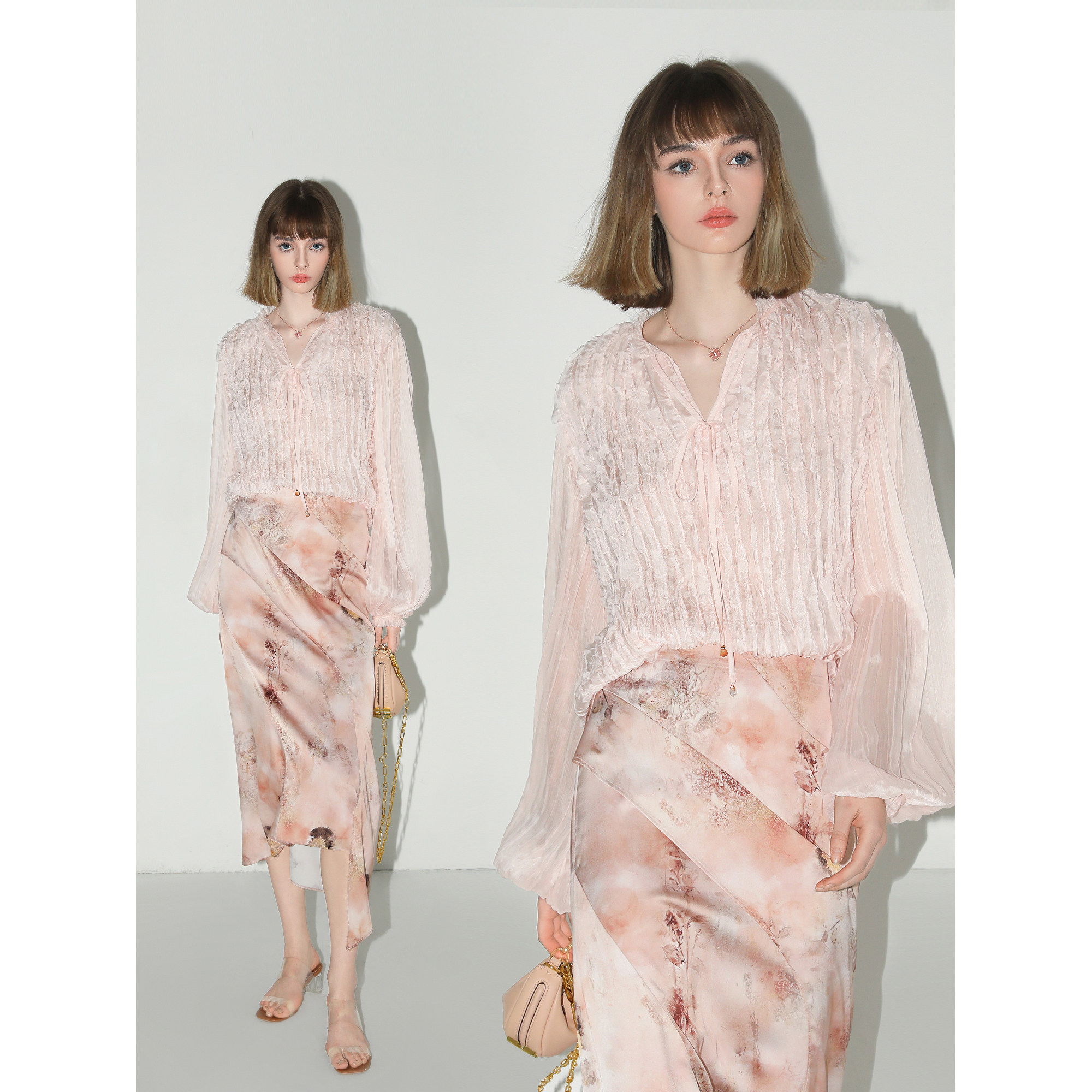COCOBELLA名媛风木耳边绗缝压褶飘带衬衫女秋立领雪纺衫SR3006-2