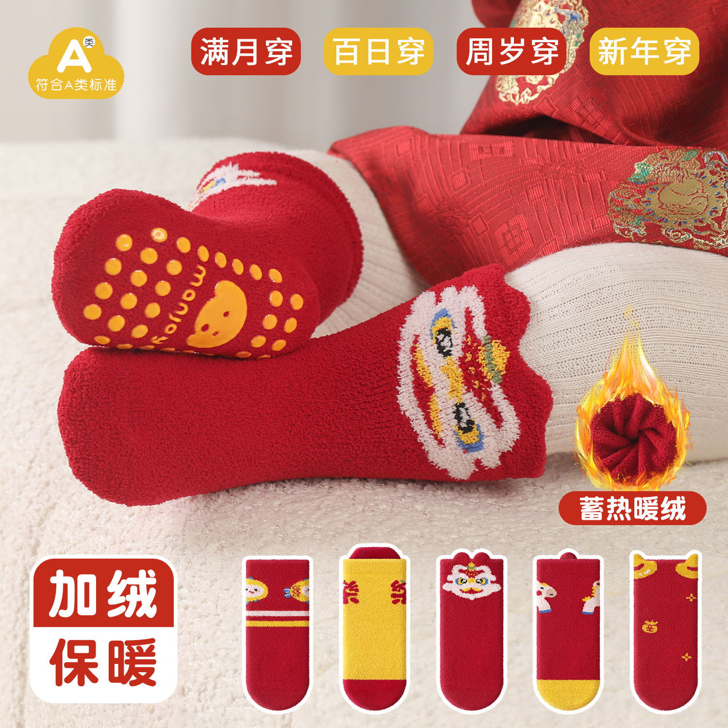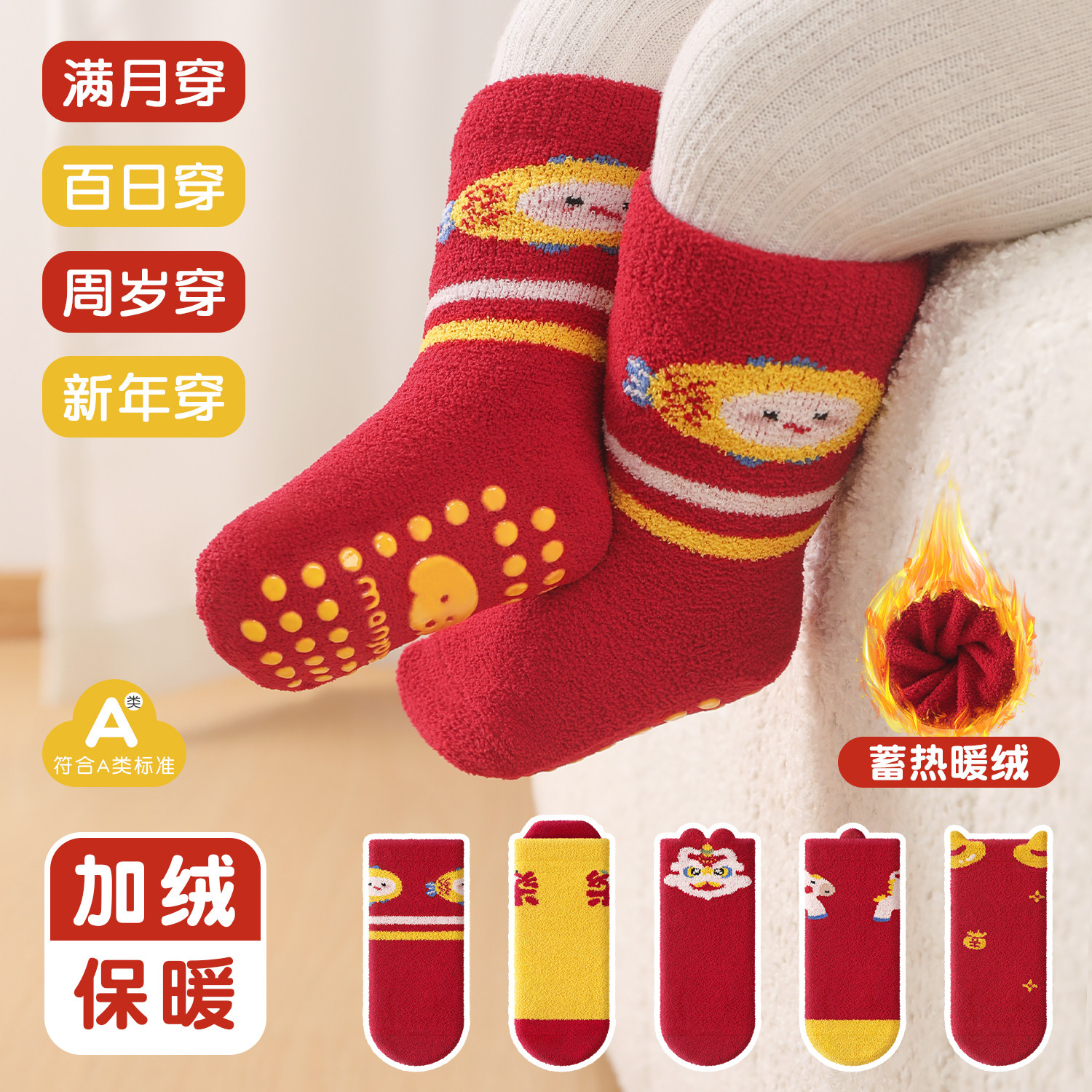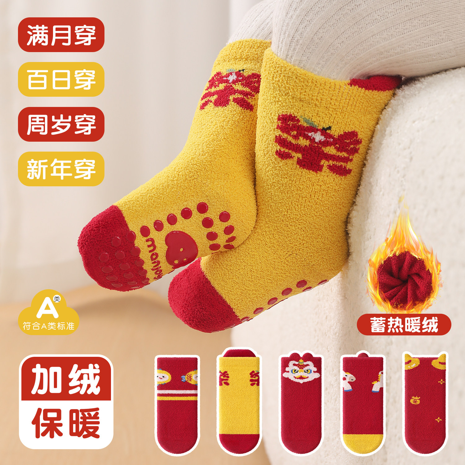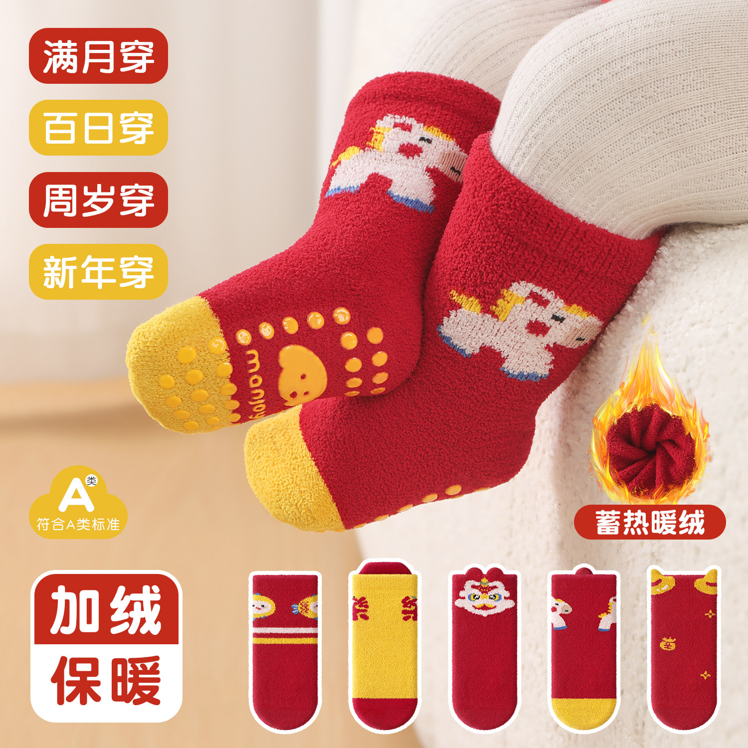 0-6月新生儿宝宝新年大红色地板袜加绒满月周岁袜中筒点胶童袜子