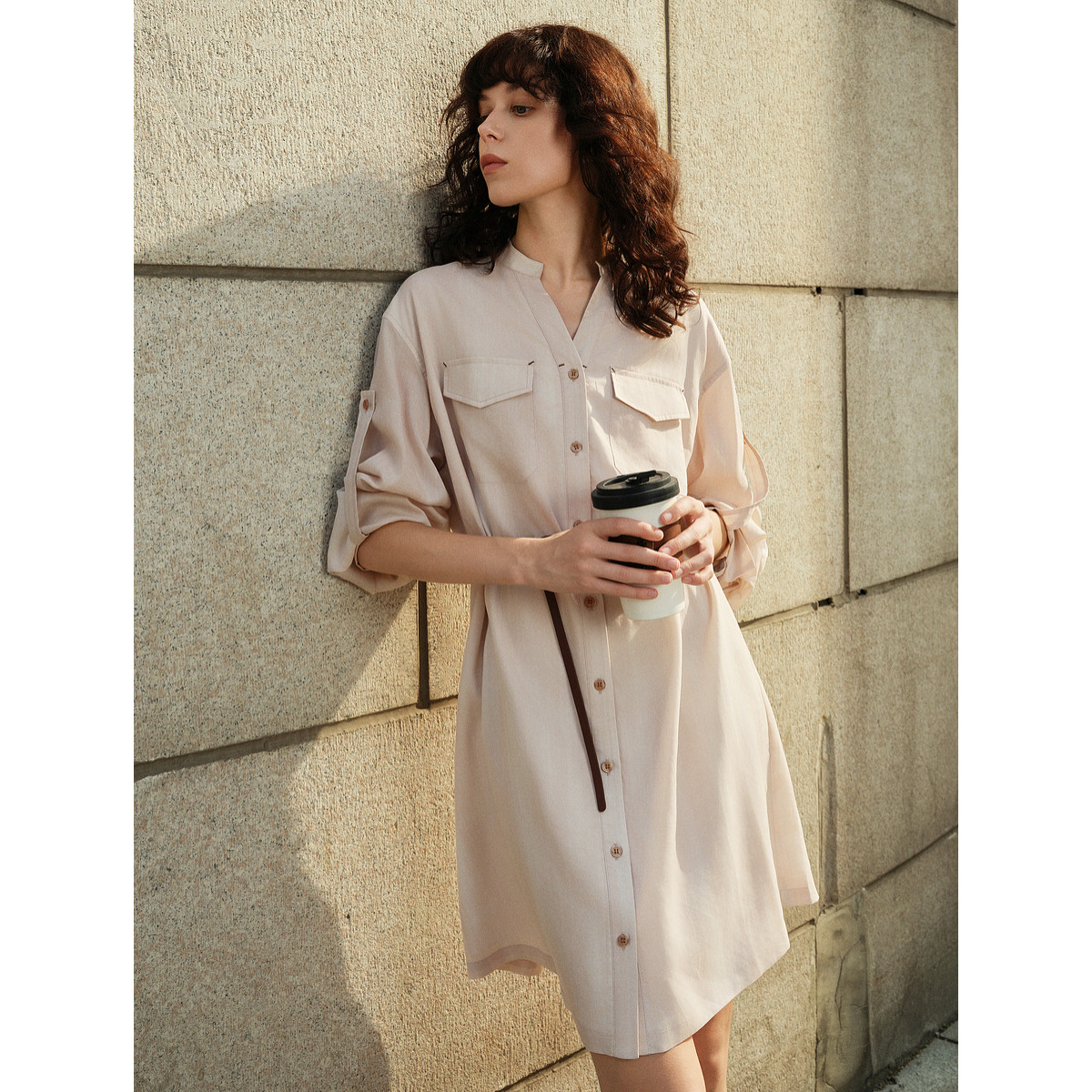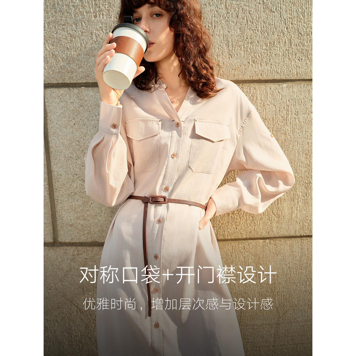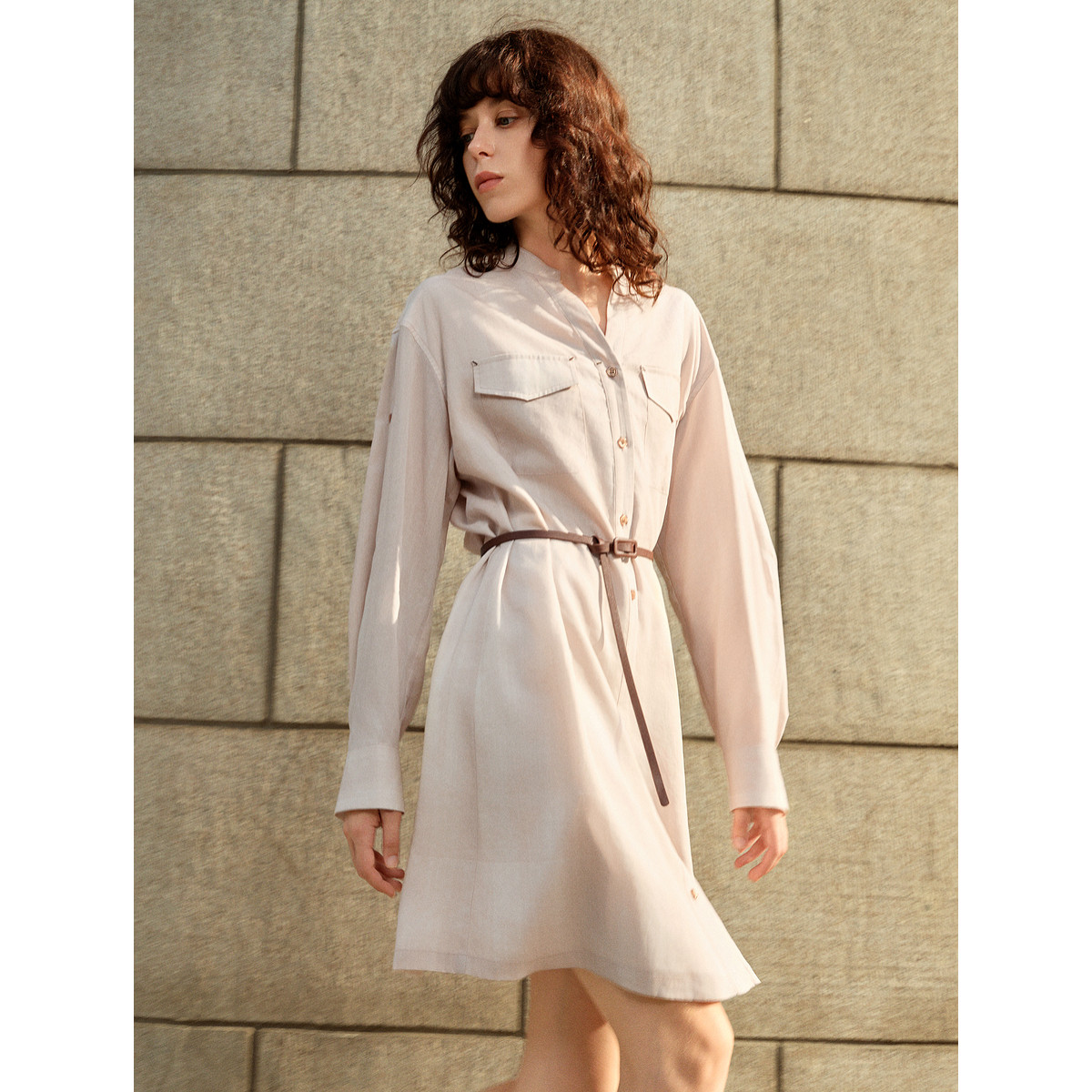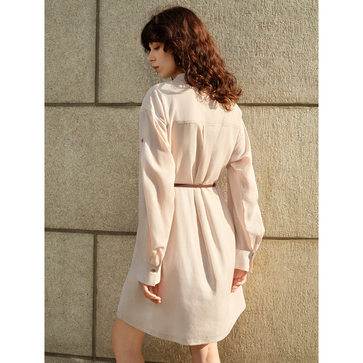 ELLE粉色肌理感衬衫式连衣裙女2025秋季新款可露丽亚麻天丝a字裙