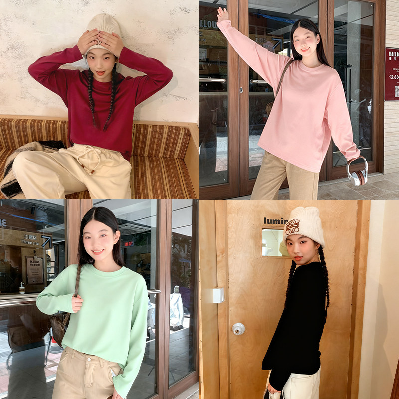 春秋莫代尔长袖打底衫女圆领休闲大码纯色上衣宽松T恤衫薄款秋衣