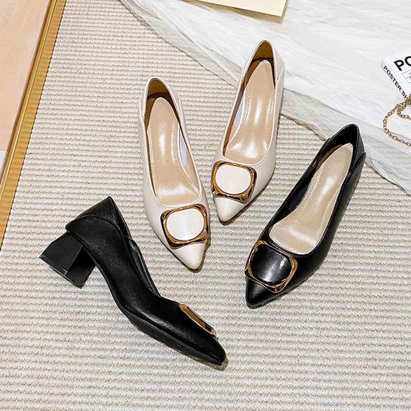 真皮~骄屿复古浅口高跟鞋山茶花一字扣粗跟单鞋尖头气质玛丽珍鞋