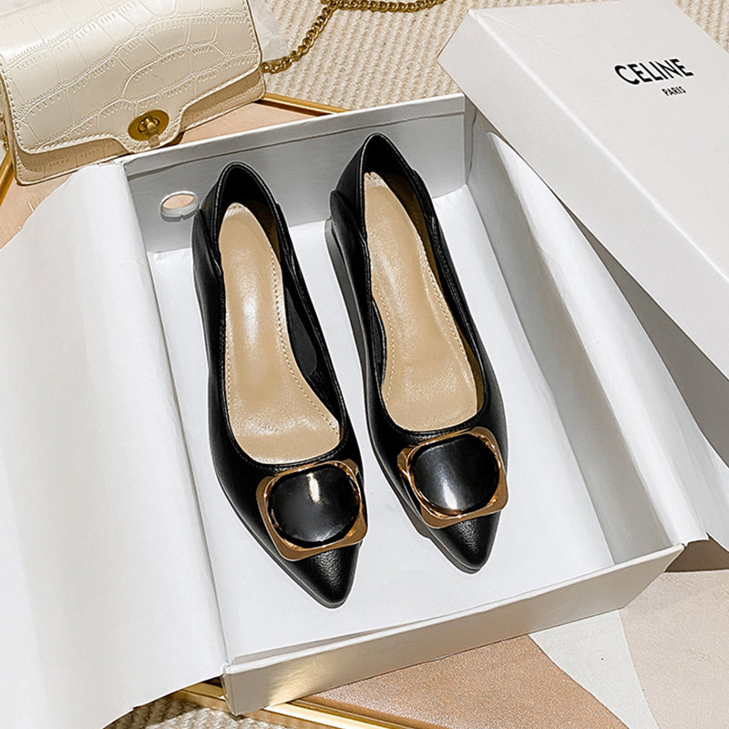 米霏!真皮~尖头铆钉平底单鞋女秋冬浅口内增高软底瓢鞋大码女鞋