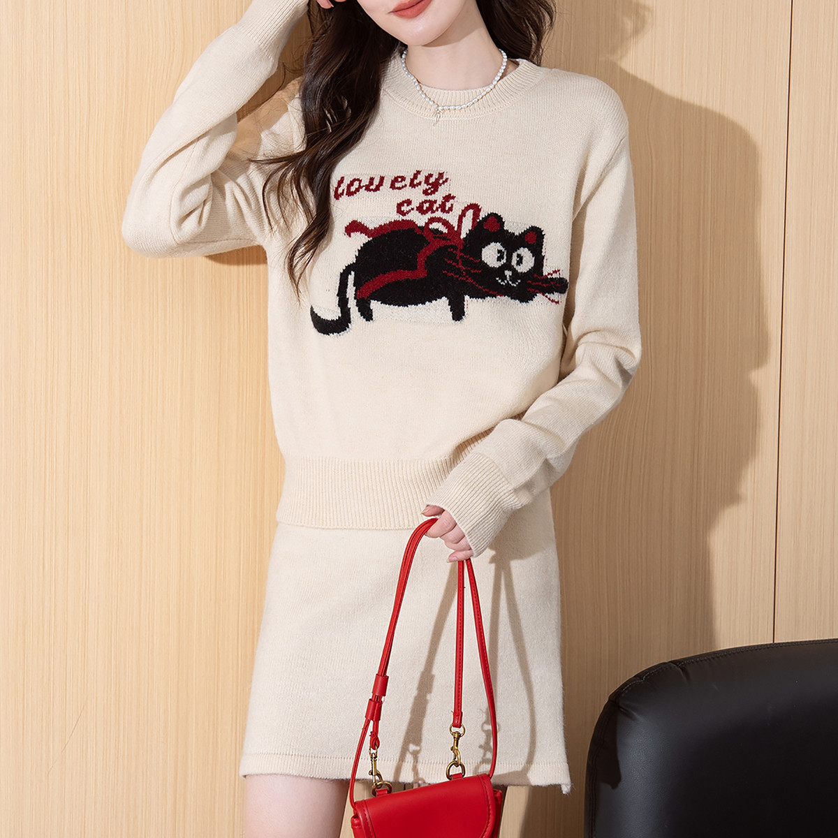 唐狮秋冬套装女杏色卡通小猫圆领套头毛衣半裙两件套超好看TM