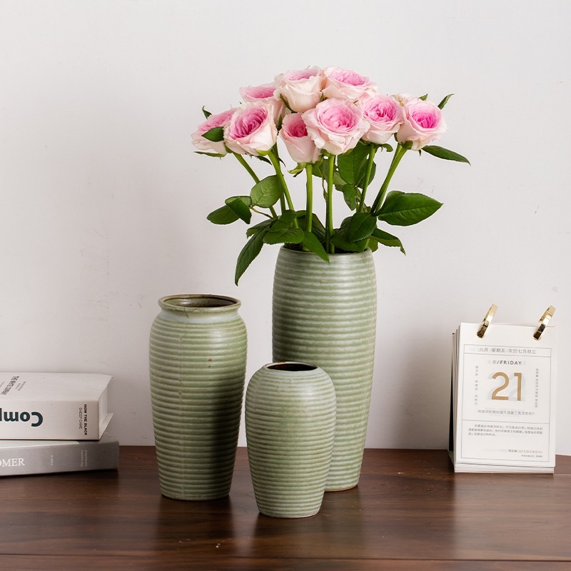 新中式复古陶瓷花瓶干花鲜花陶罐客厅插花摆件轻奢高级感绿色花器