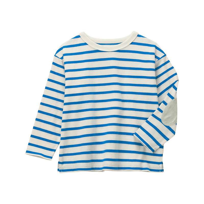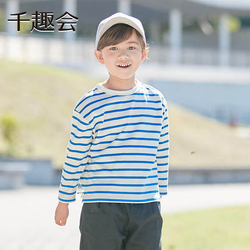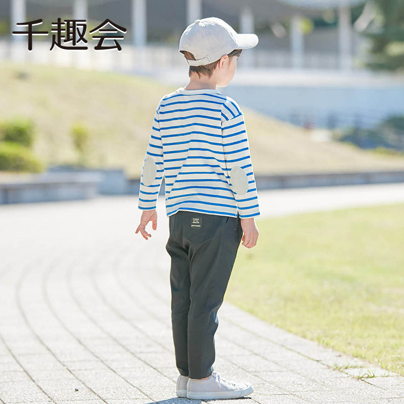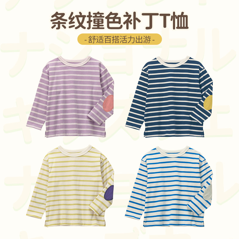 千趣会童装儿童25春秋长袖棉T恤袖子补丁装饰男女童条纹打底上衣