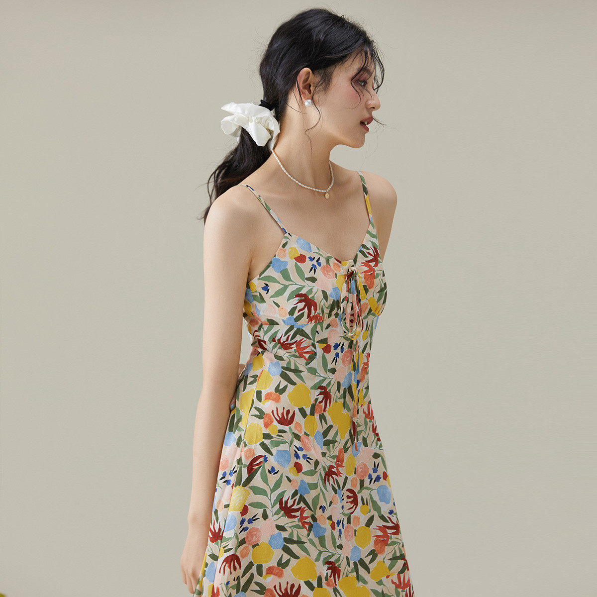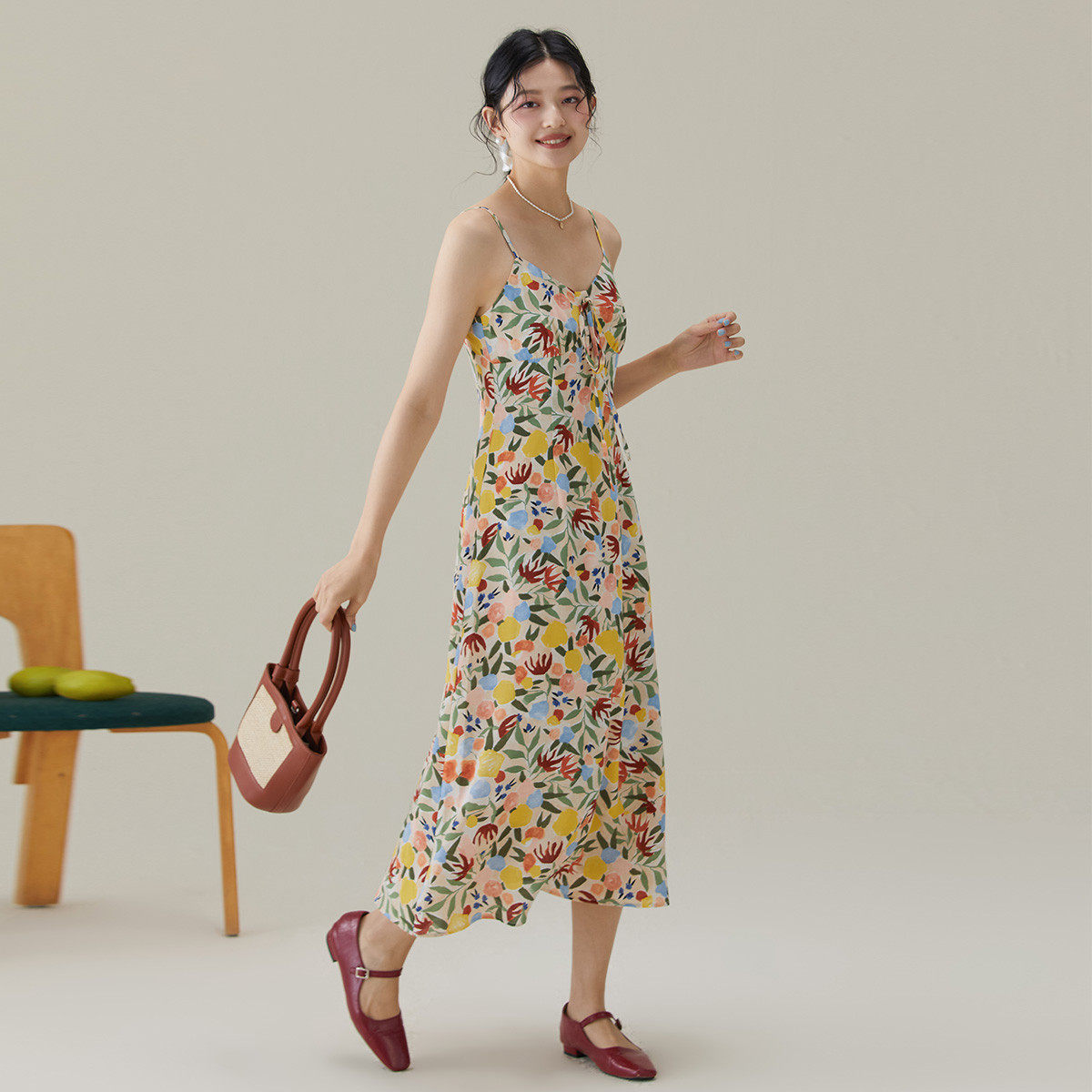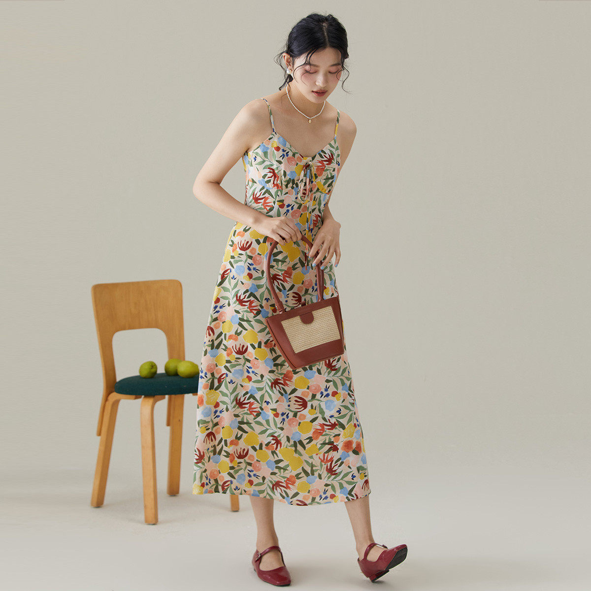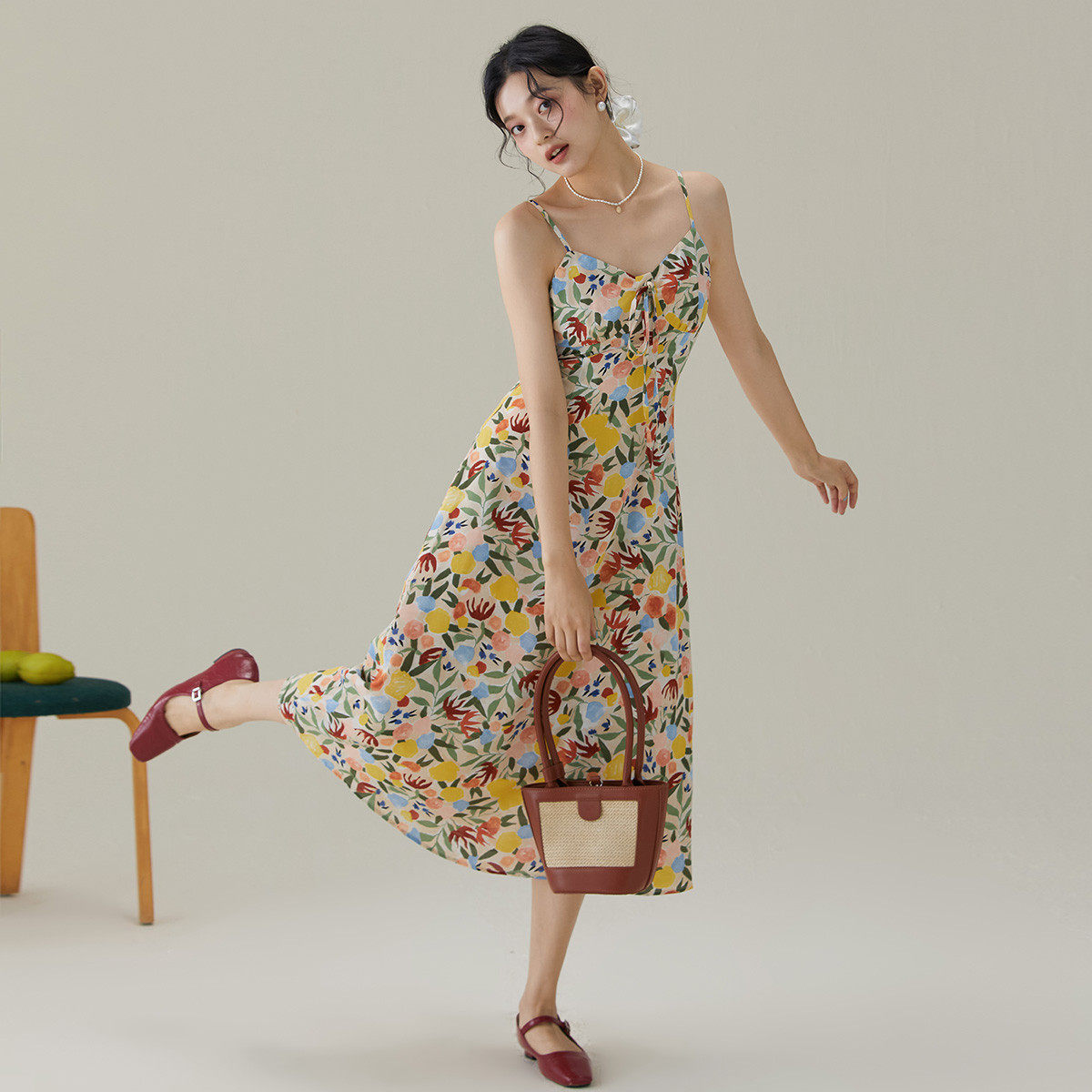 one more2025夏季新款v领碎花吊带连衣裙女修身雪纺裙高级感裙子