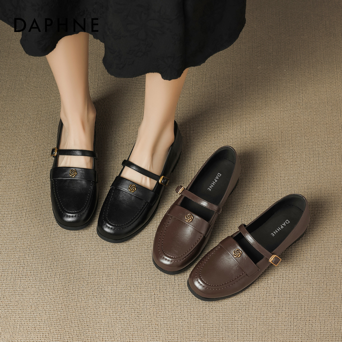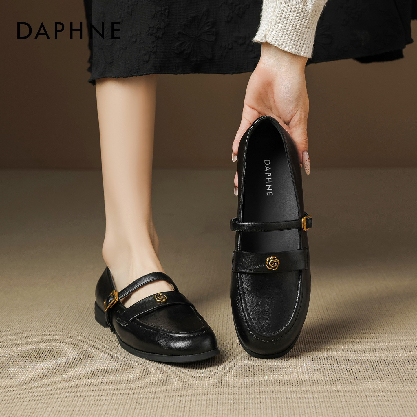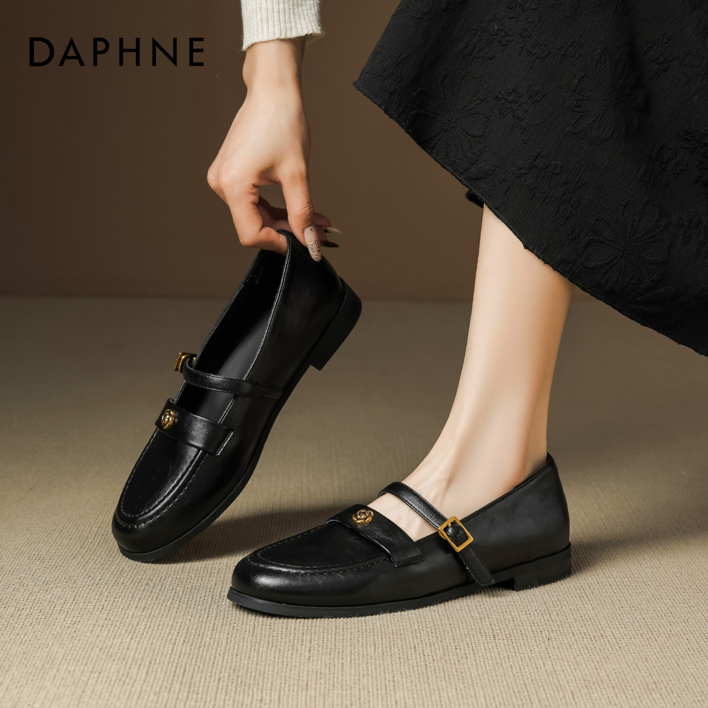 达芙妮黑色乐福鞋女2026春季新款山茶花小皮鞋软底配裙子平底单鞋