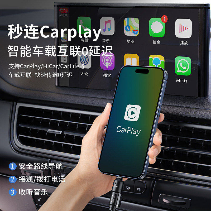 适用于苹果车载CarPlay投屏充电器超级快充线carlife四合一伸缩弹簧数据线Typec汽车导航互联iPhone16华为线