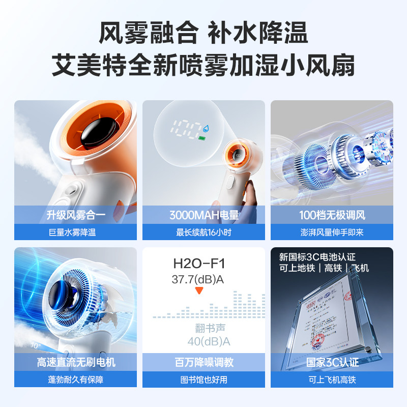 艾美特喷雾加湿迷你小风扇手持桌面风扇暴力风扇办公便携小风扇USB充电风扇学生宿舍风扇小型风扇户外风扇F1