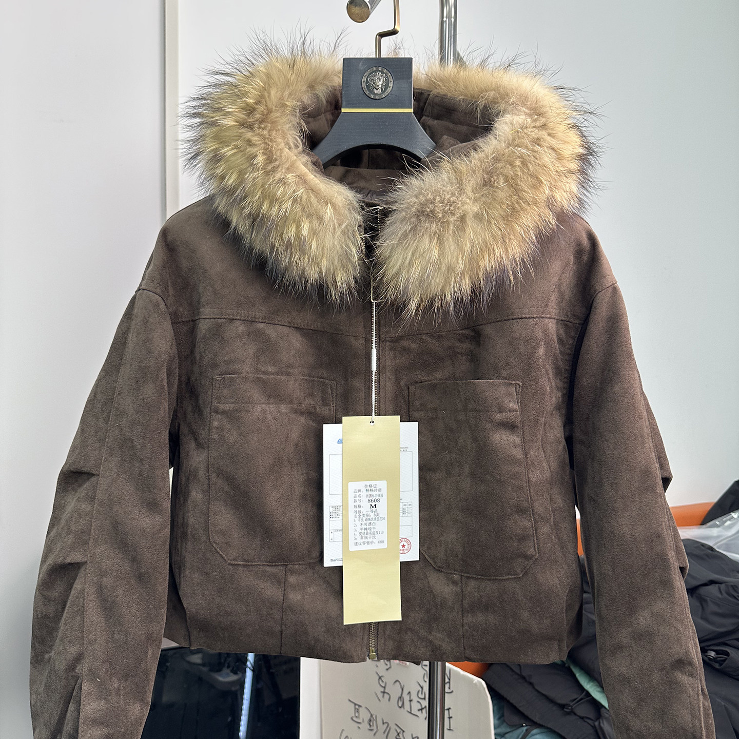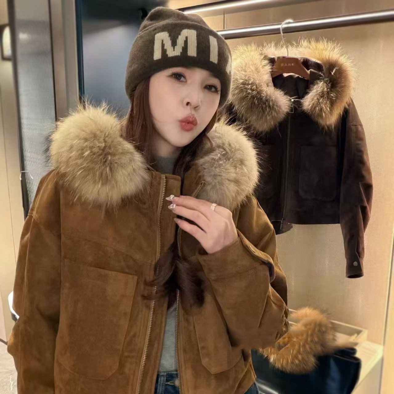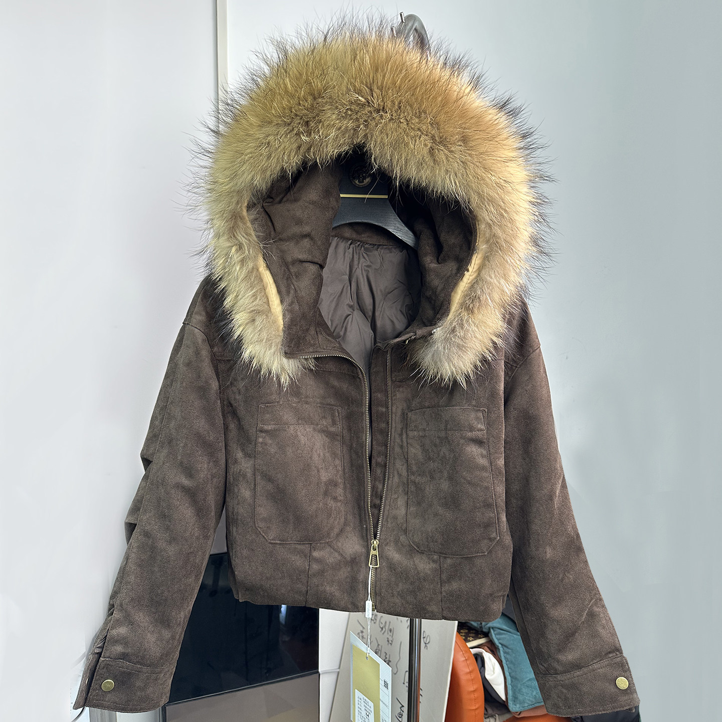 貉子毛领鹿皮绒羽绒服女短款冬季连帽真毛女士时髦羽绒派克服上衣