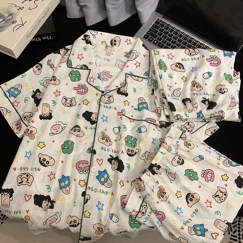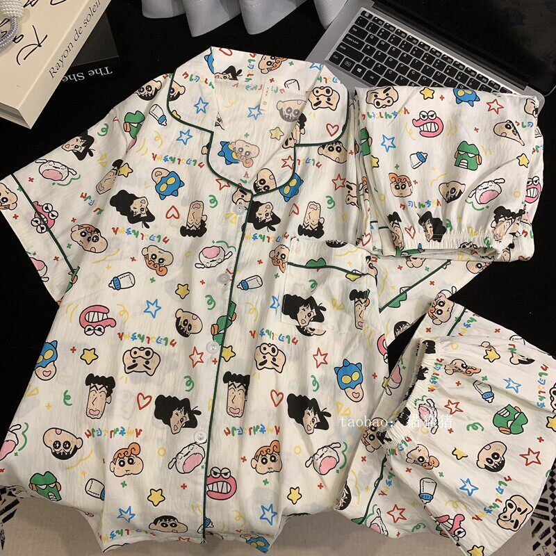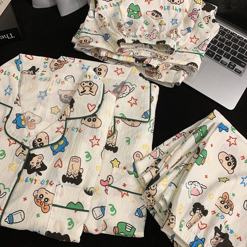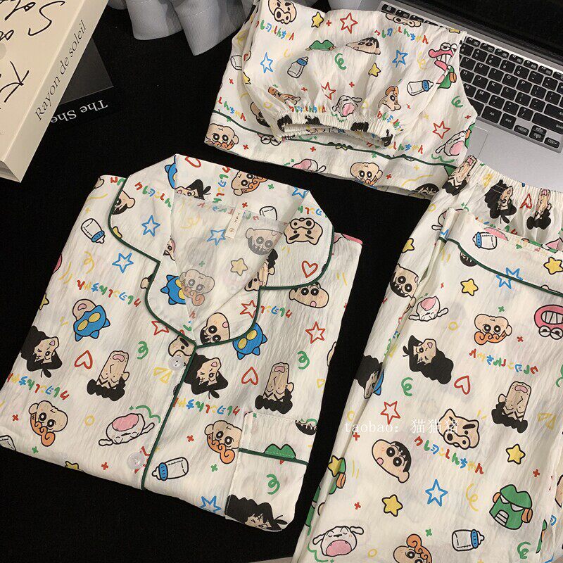 红豆蜡笔小新情侣纯棉睡衣女夏季短袖三件套棉绸大码宽松男士家居