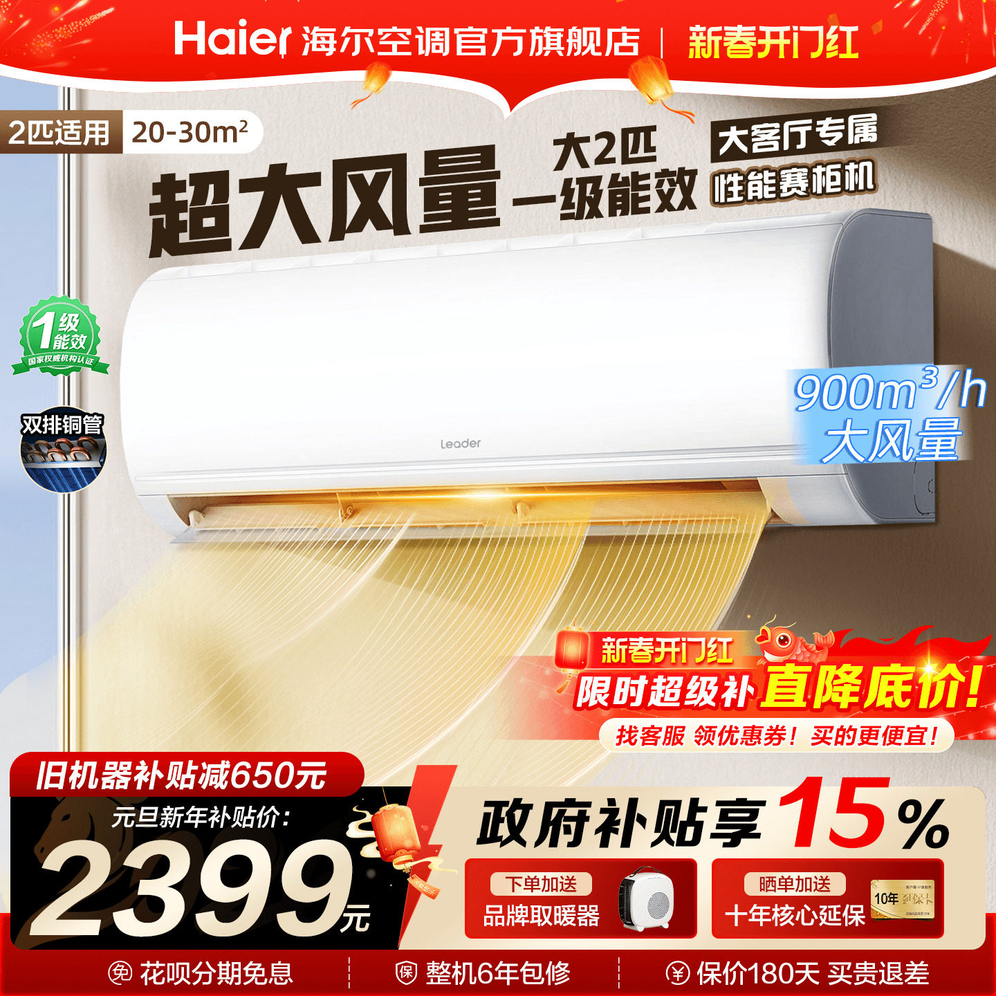 海尔空调大挂机2匹3匹家用一级能效变频统帅客厅卧室冷暖用旗舰店