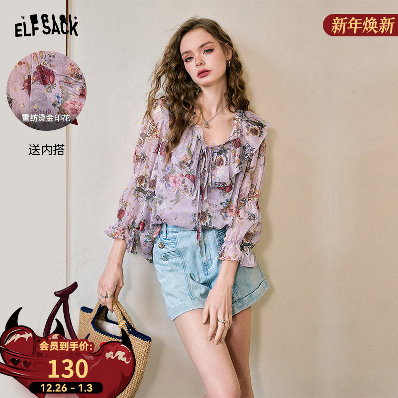 妖精的口袋法式荷叶边烫金印花雪纺衫女2025春季新款洋气纱衣罩衫