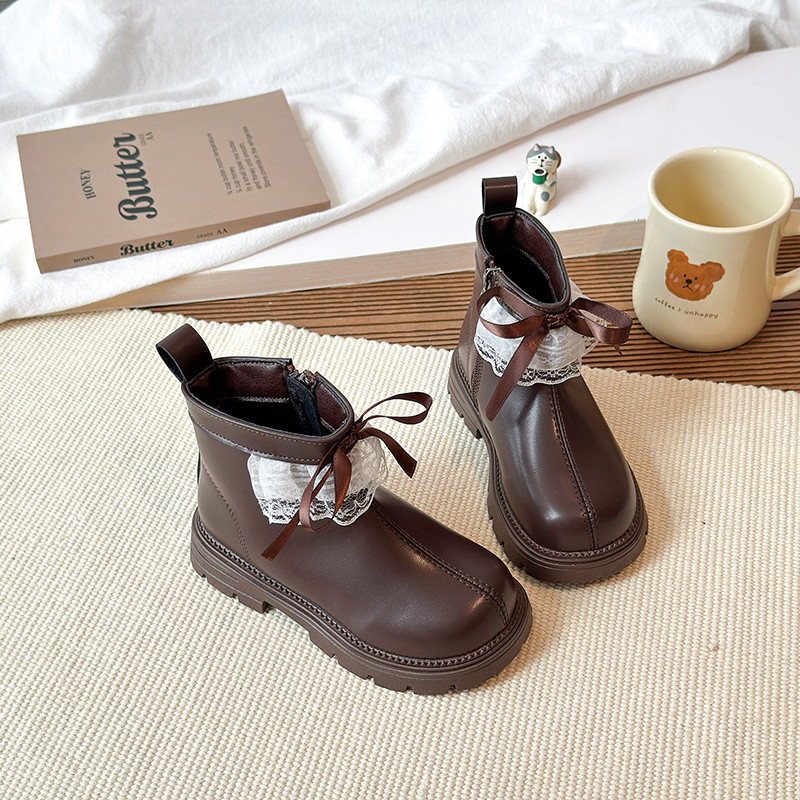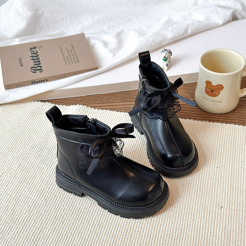 巴布豆女童加绒蕾丝皮靴2025冬季新款儿童鞋加绒保暖棉鞋儿童靴子