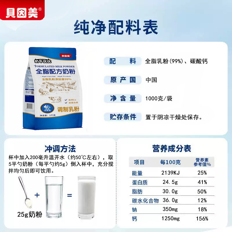 贝因美成人奶粉1kg袋装儿童青少年全脂中老年全家0蔗糖高钙牛奶粉