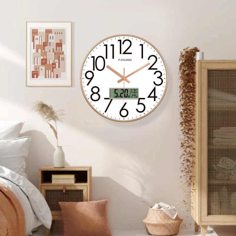 事事如意日历星期温度自动对时电波静音挂钟客厅卧室石英钟表挂墙