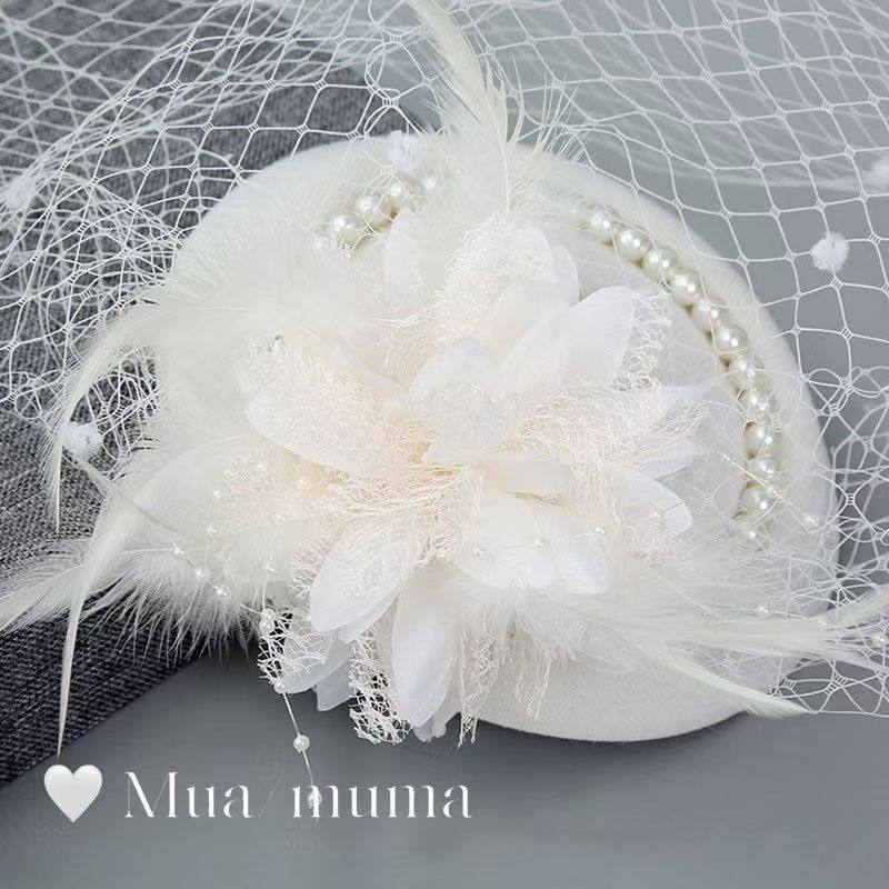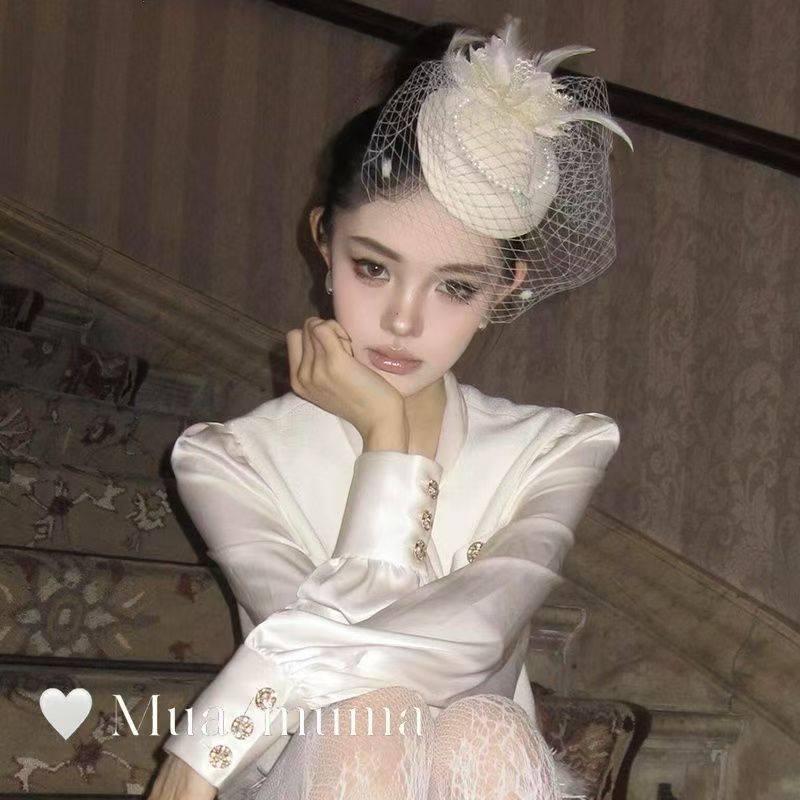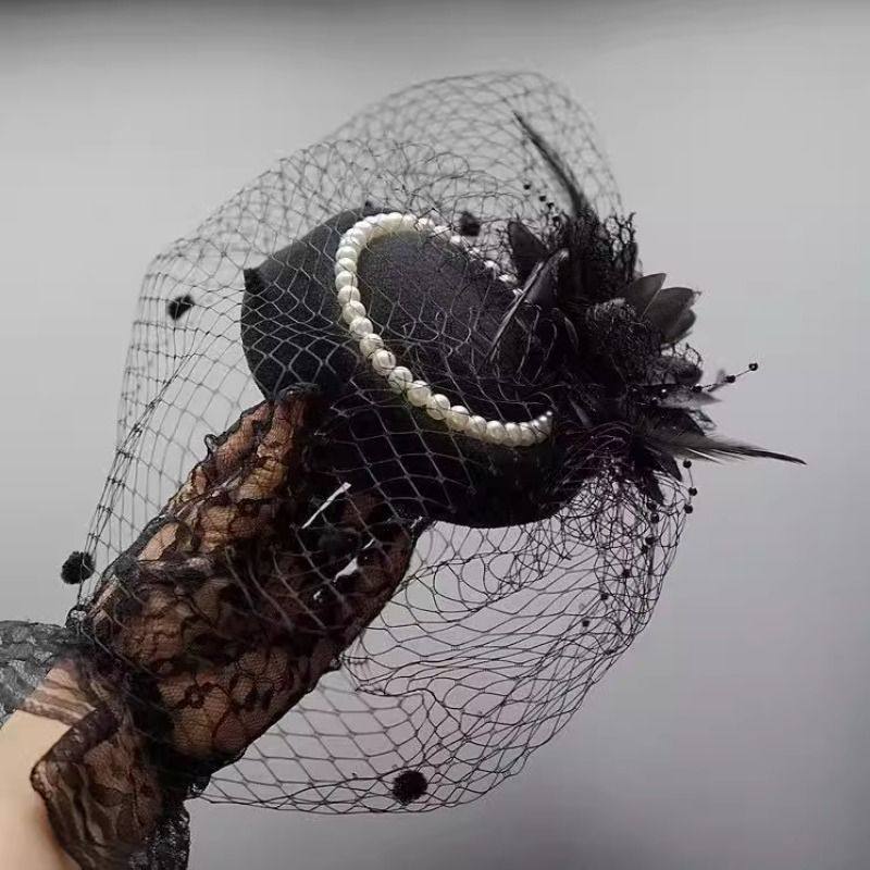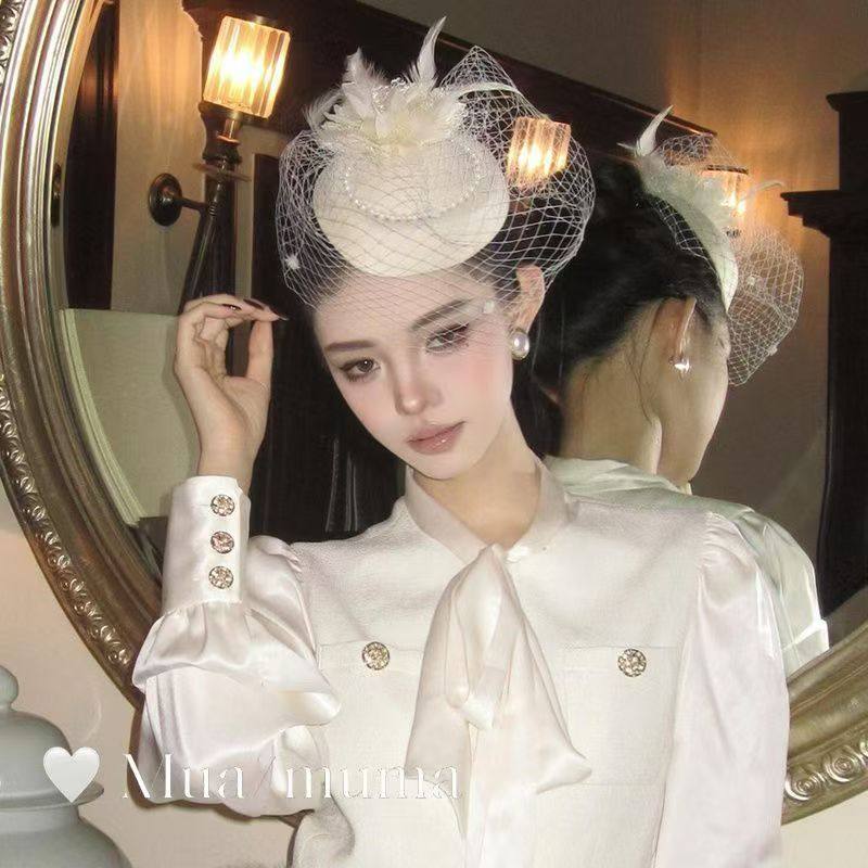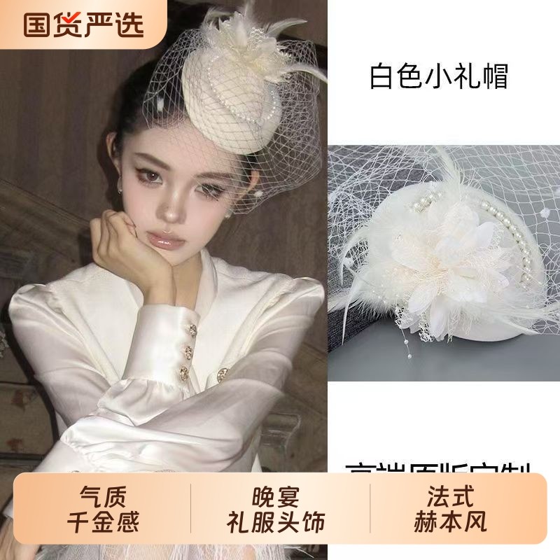 法式赫本风小礼帽旗袍复古民国白色仿珍珠帽子女面纱晚宴礼服头饰