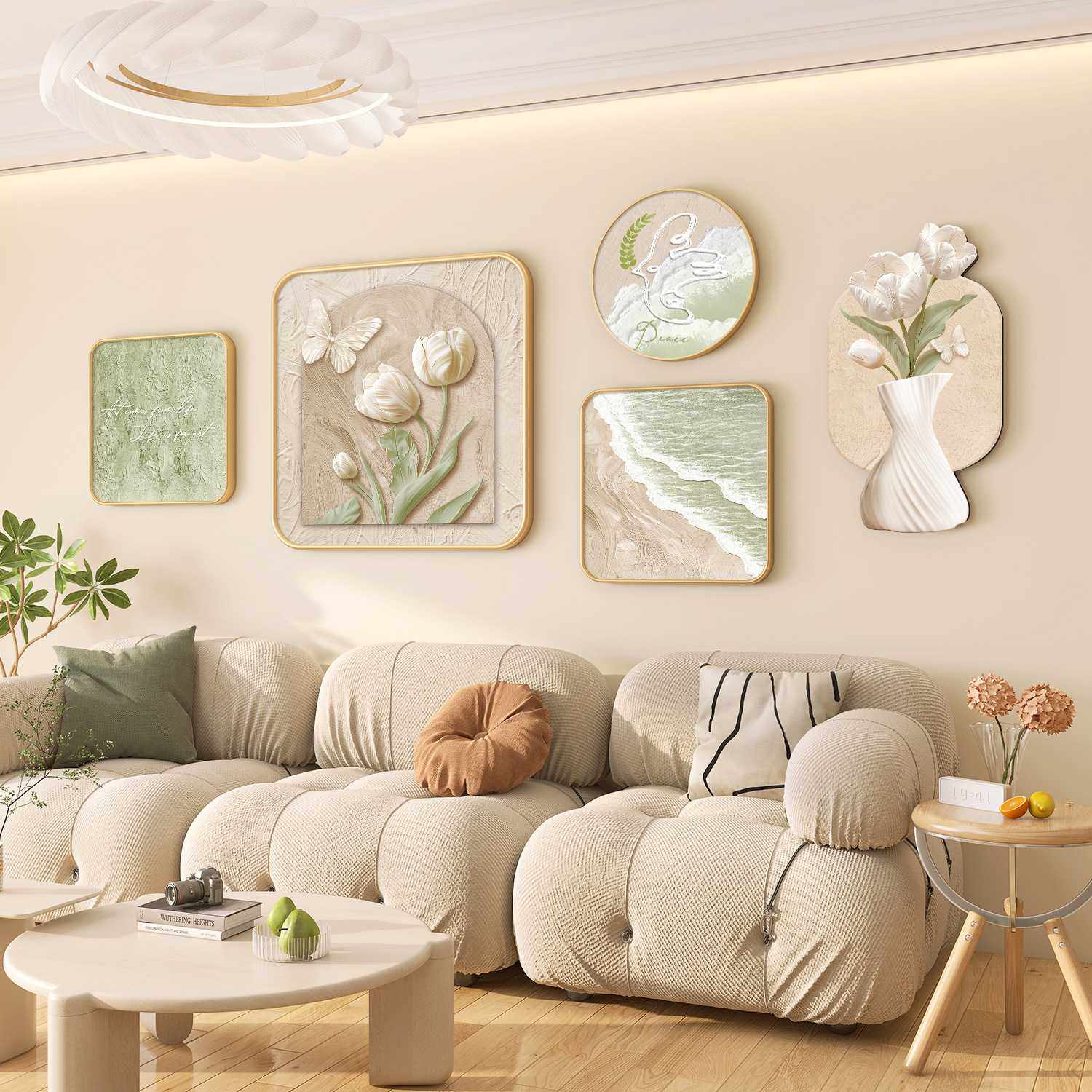 北欧奶油风客厅装饰画沙发背景墙高级感挂画现代清新绿植组合壁画