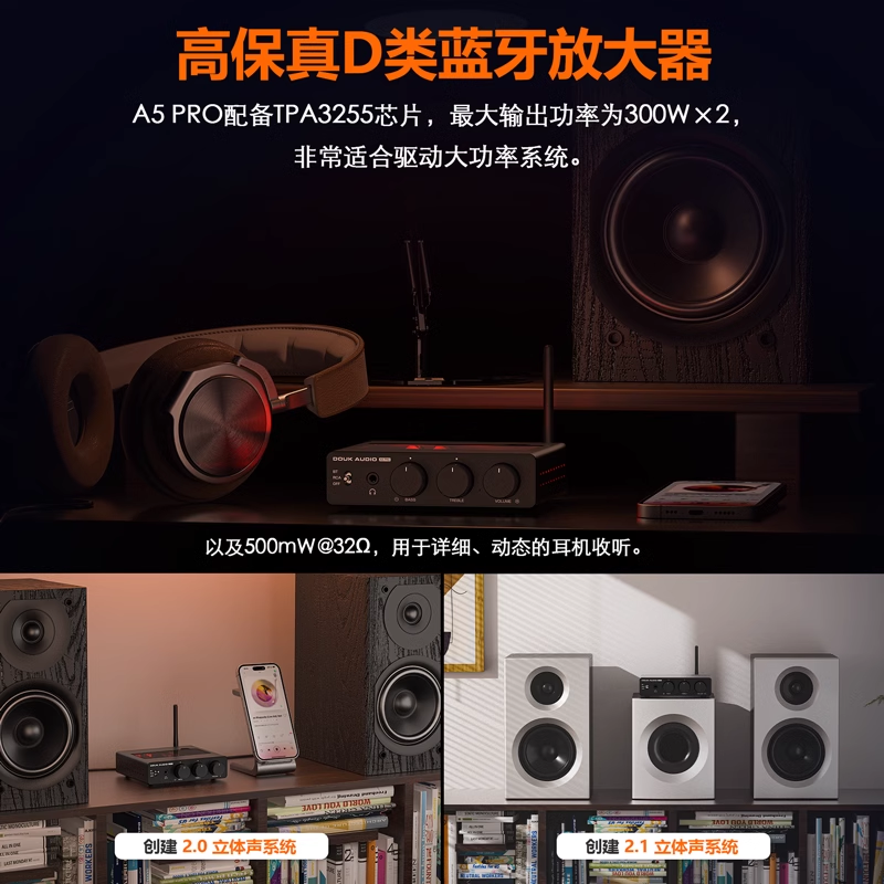 DOUK AUDIO A5 PRO TPA3255蓝牙5.3功放高低音调节耳机输出耳放