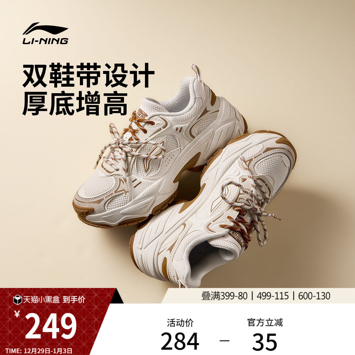 李宁红糖2丨休闲鞋女25冬季新款复古老爹鞋厚底增高双鞋带运动鞋