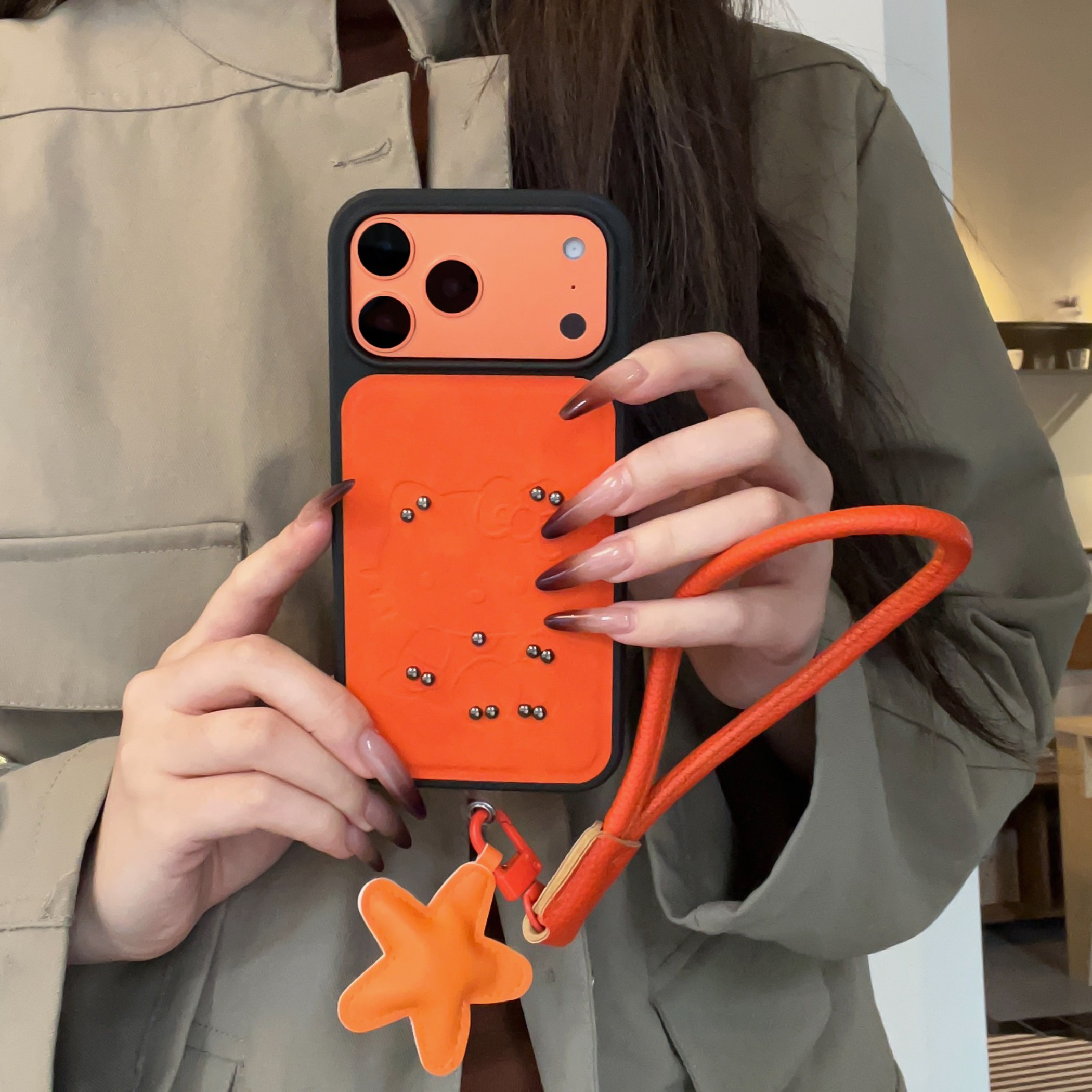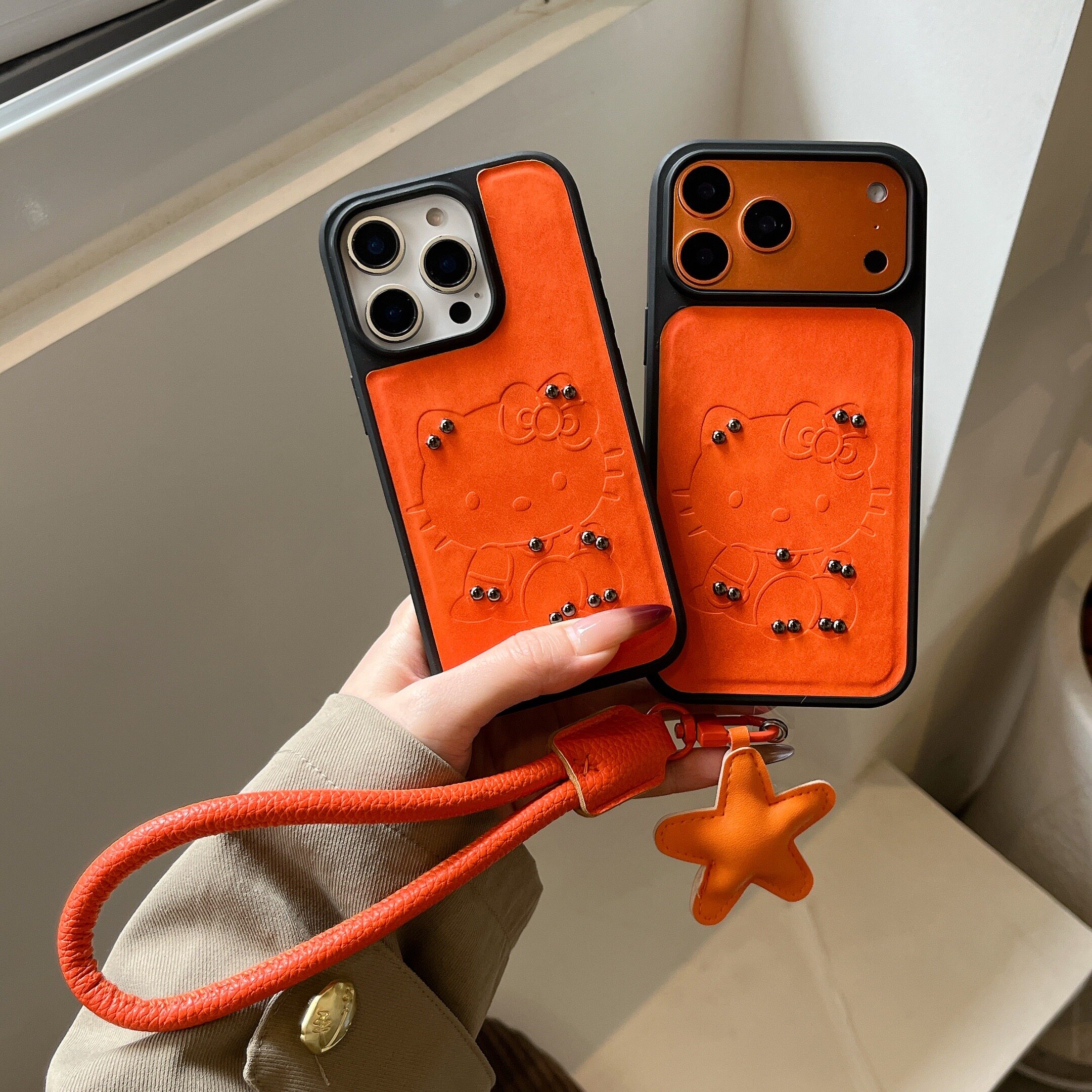 淳于亦ins高级铆钉凯蒂猫适用苹果17promax手机壳15全包按键黑框大视窗14/13创意小羊皮星星挂绳16保护防摔壳