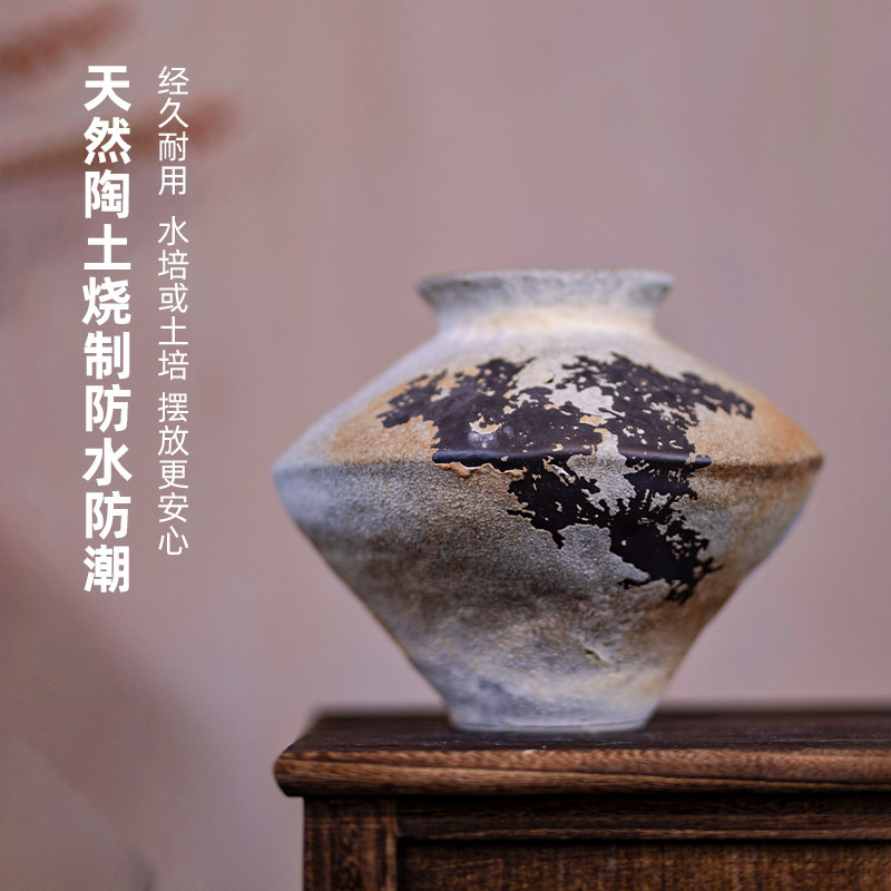 景德镇陶瓷花瓶复古日式客厅装饰摆件粗陶花插干花高级感双耳飞碟