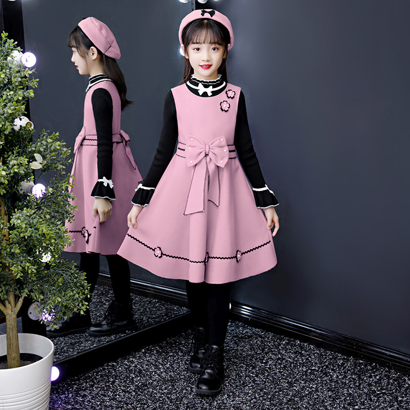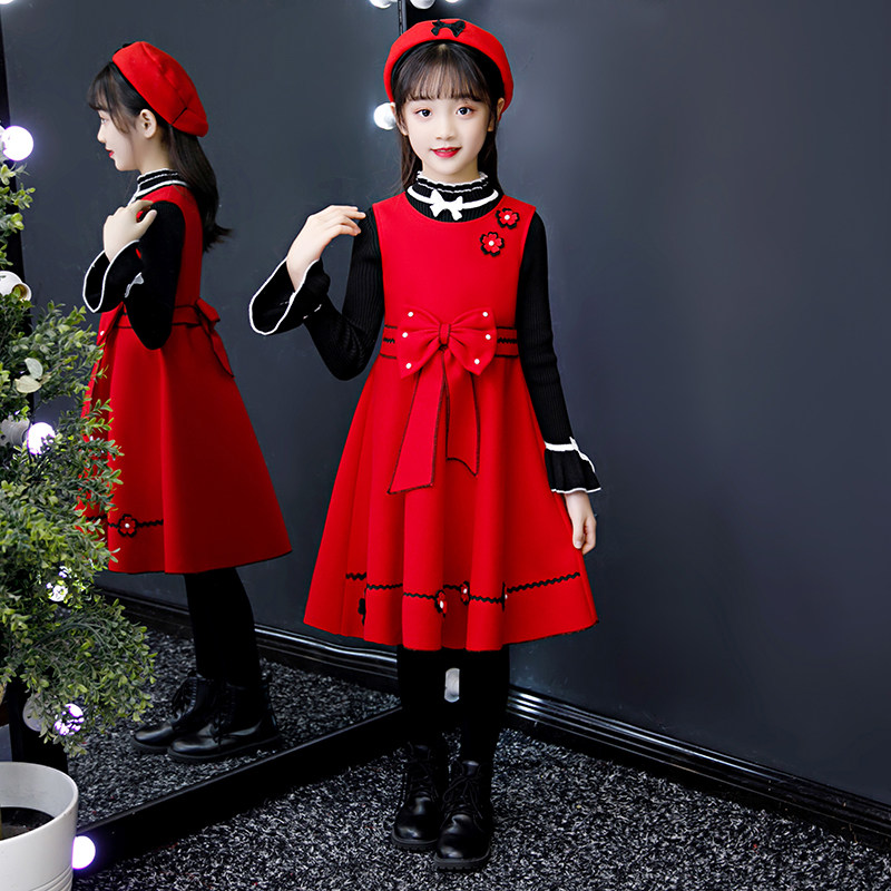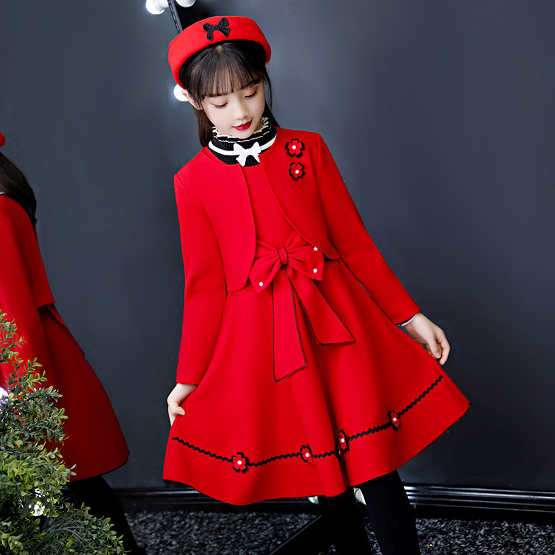 女童秋冬连衣裙新款韩版红色毛呢套装儿童公主裙洋气新年宝宝童装