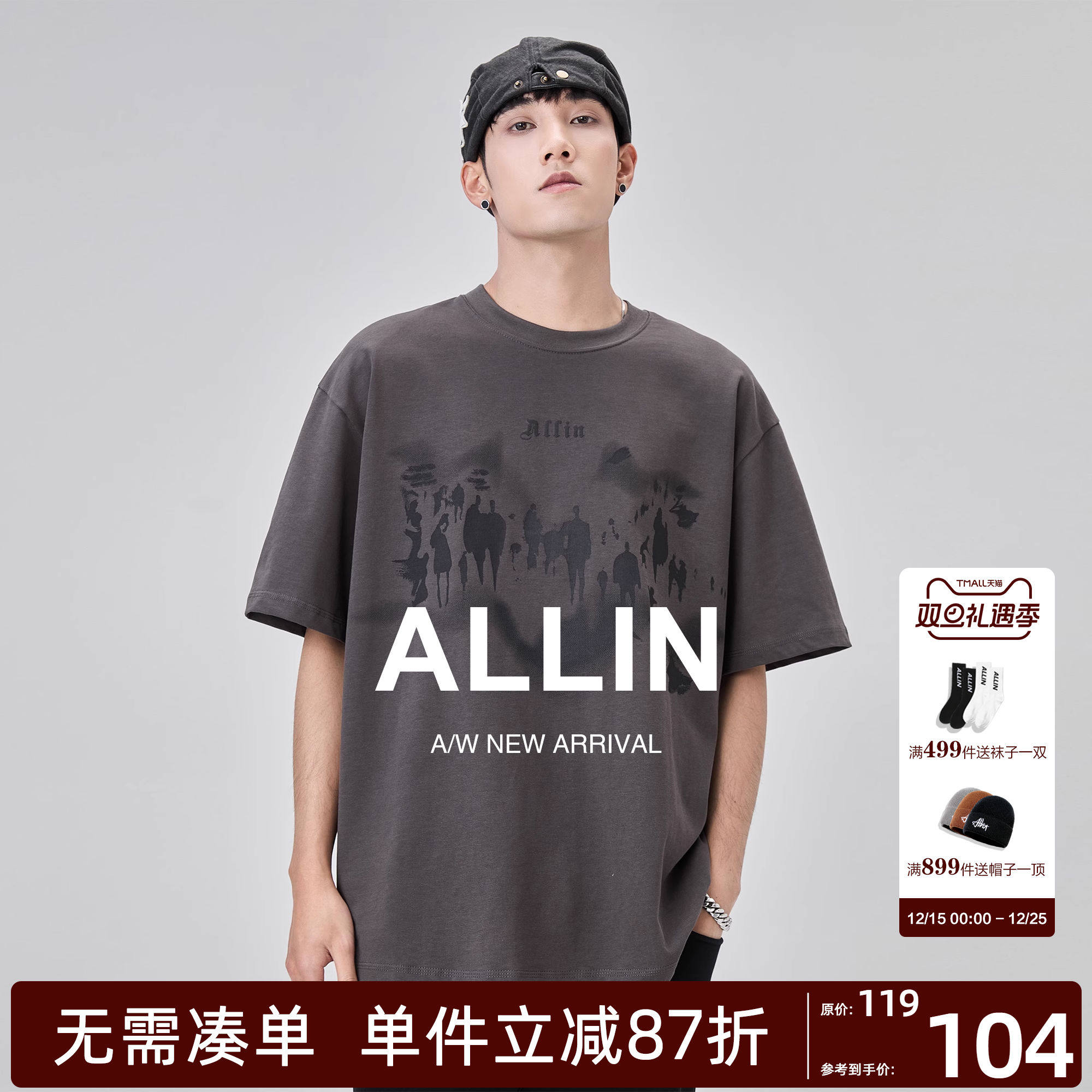 ALLIN 美式纯棉重磅短袖t恤男夏季复古水洗做旧宽松情侣半袖体恤