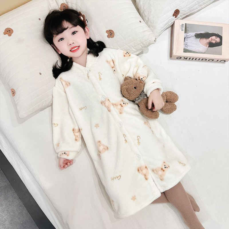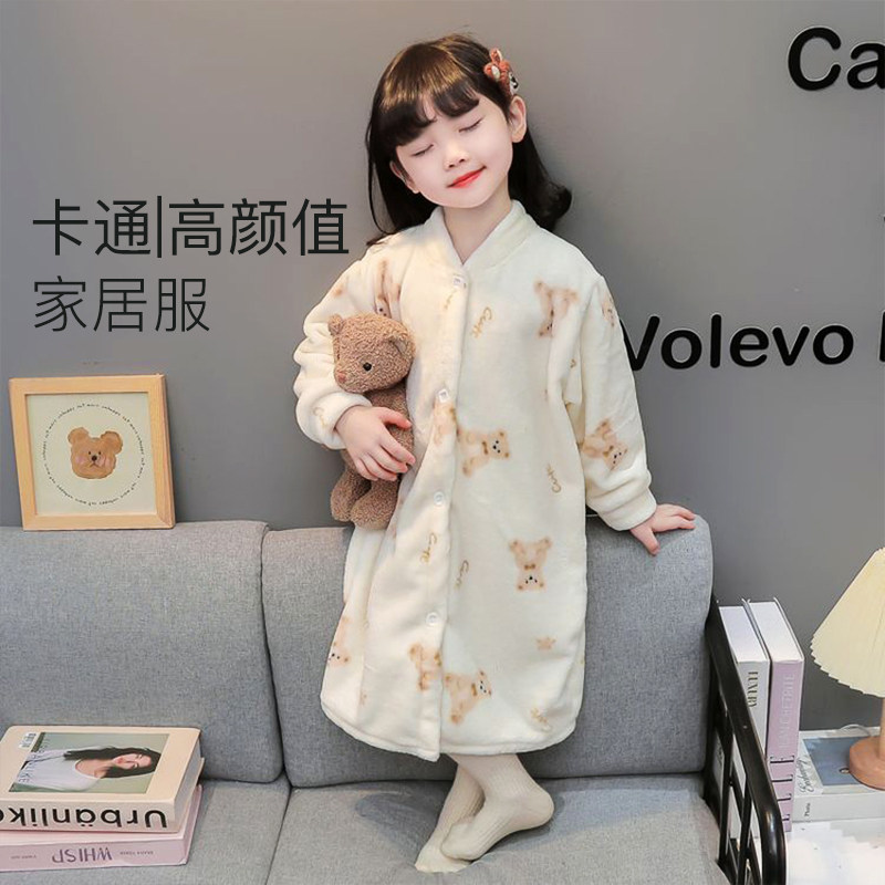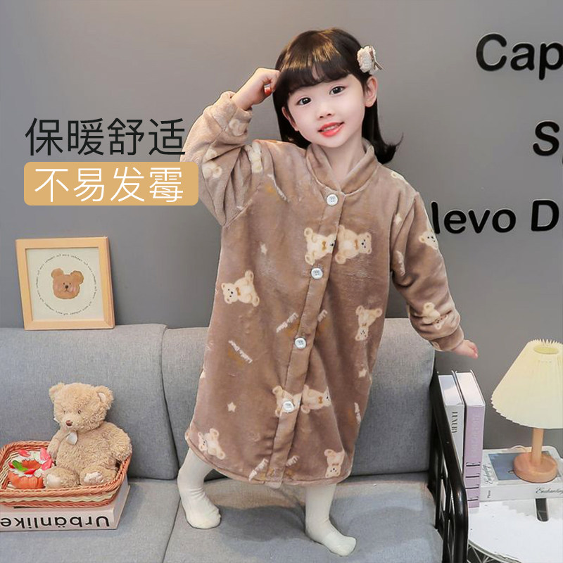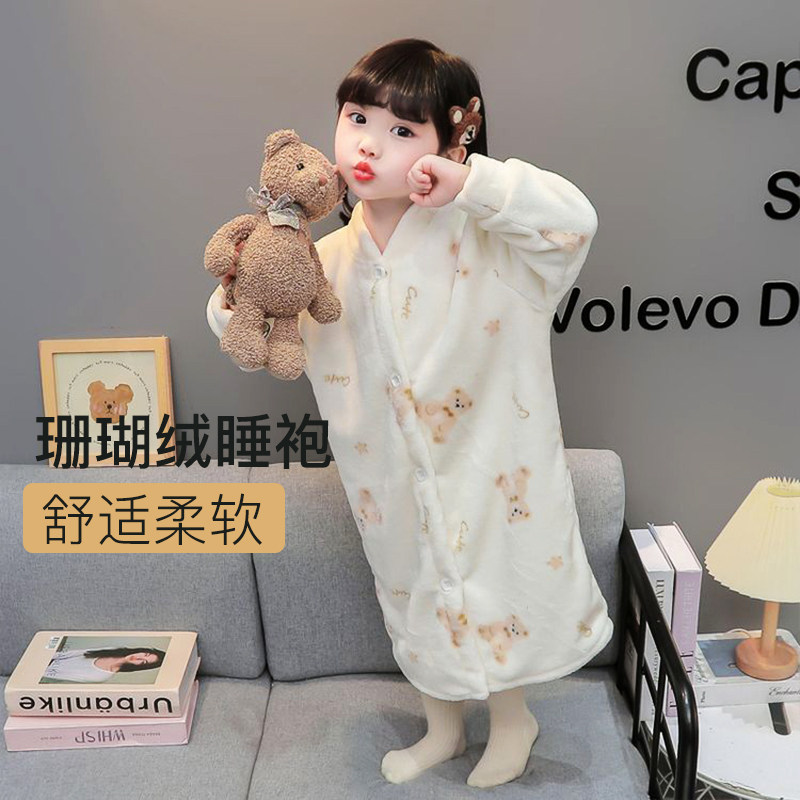 如奕儿童家居服秋冬加长加厚小童浴袍珊瑚绒保暖睡袍家用宝宝睡衣