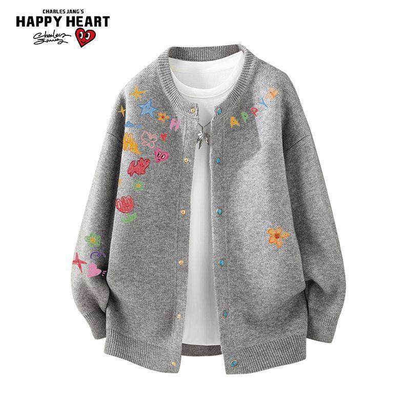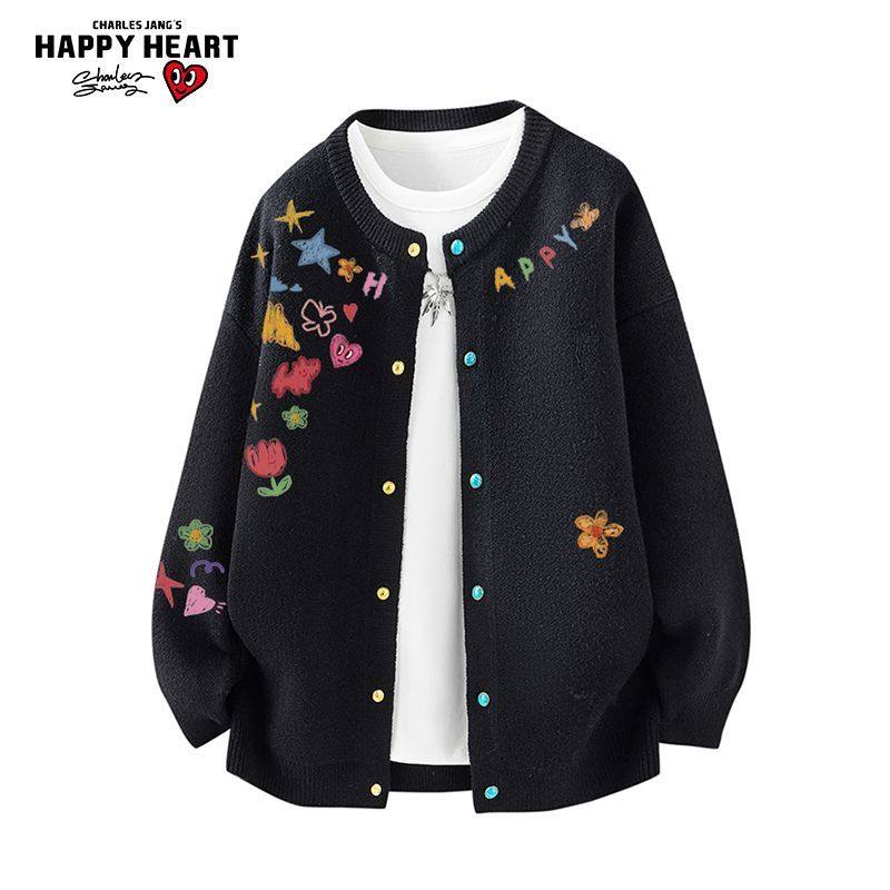 查尔斯桃心花卉印花针织开衫外套男女冬季新款休闲宽松圆领毛衣潮