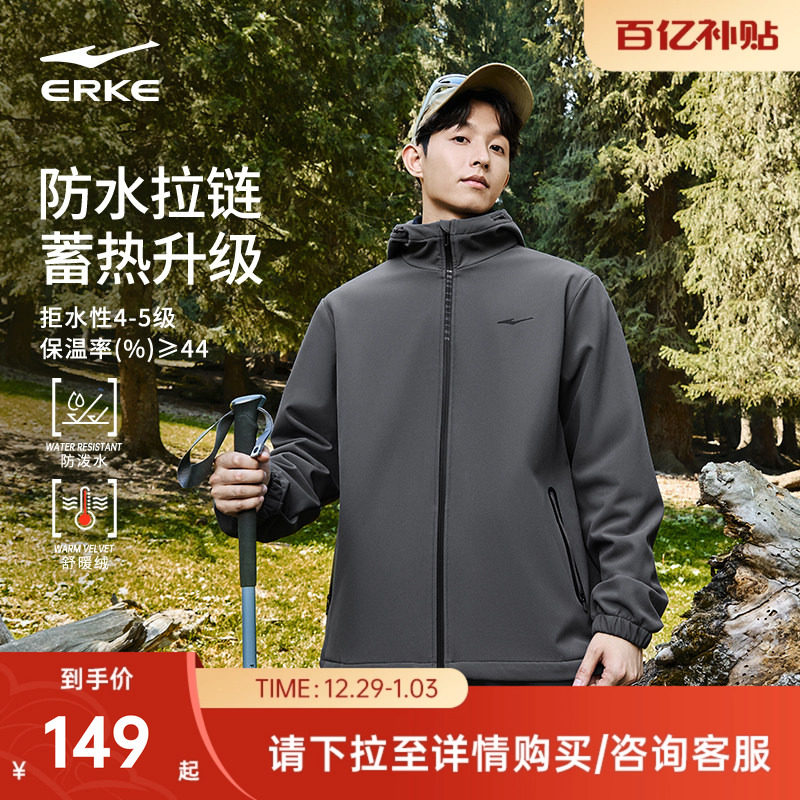 鸿星尔克加绒外套男款冬季男士软壳冲锋加厚运动夹克风衣爸爸男装