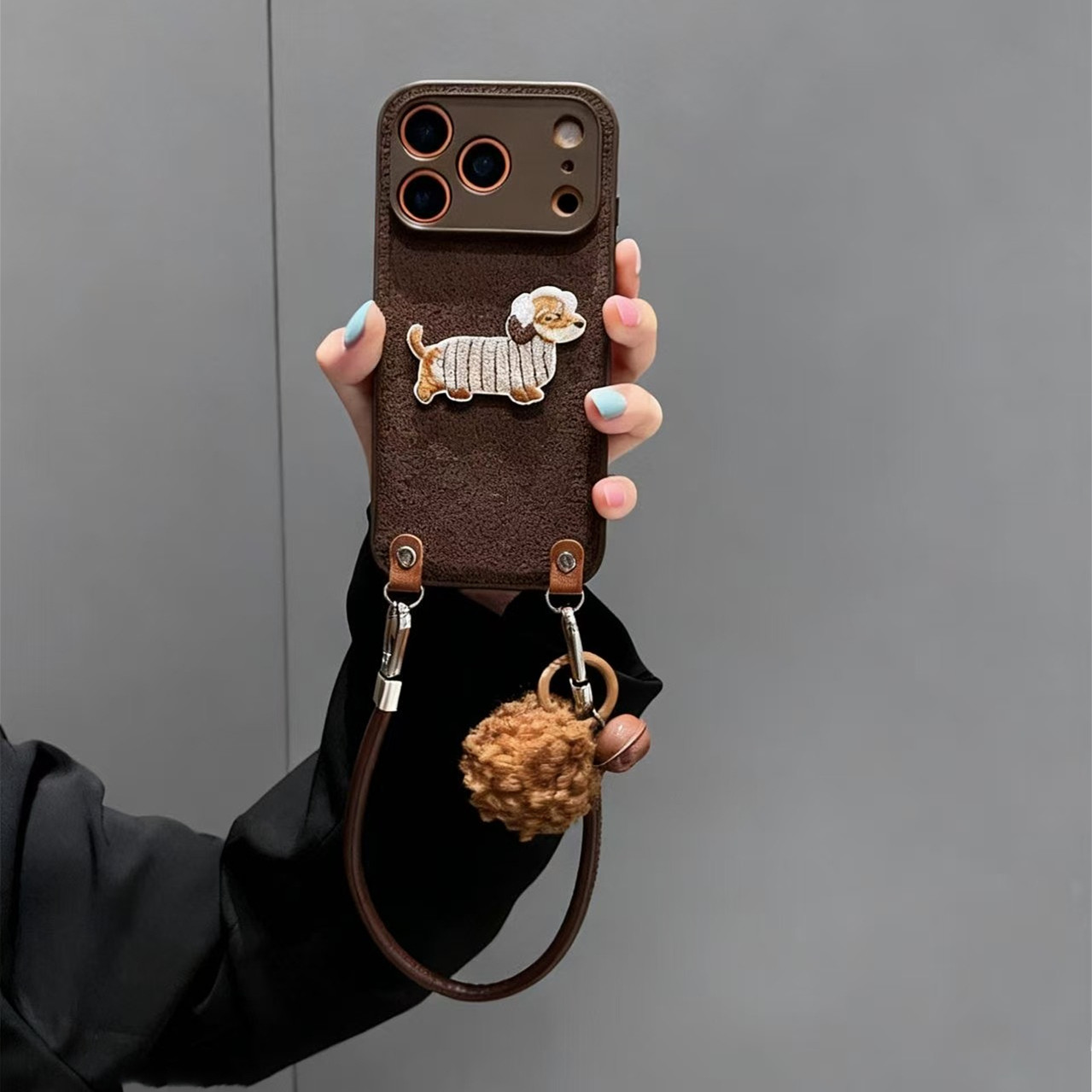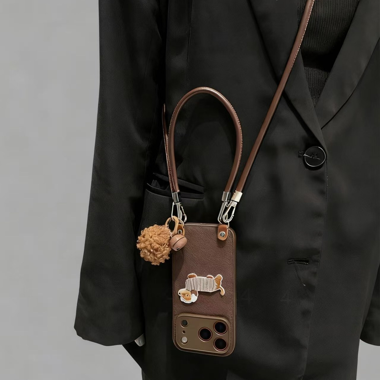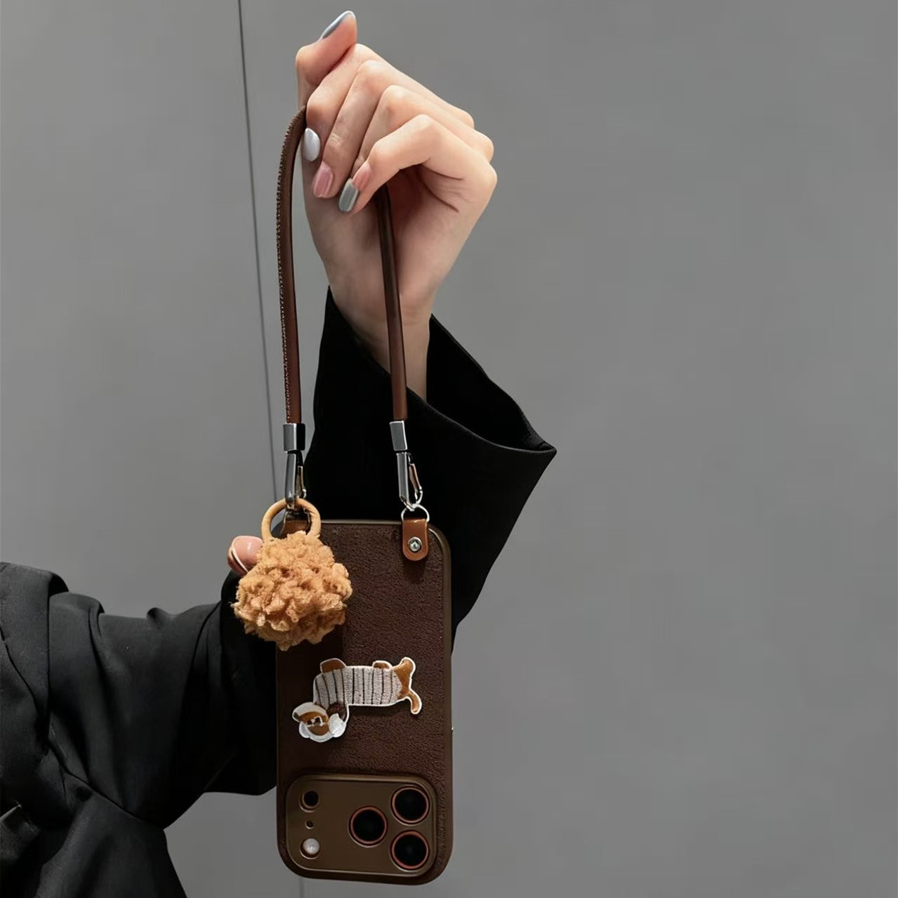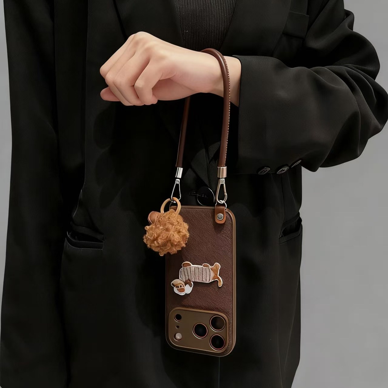 深棕色皮质月坑纹腊肠狗适用苹果17promax手机壳新款iphone16高级感14pro斜跨15可背挂绳13网红女12小众x防摔