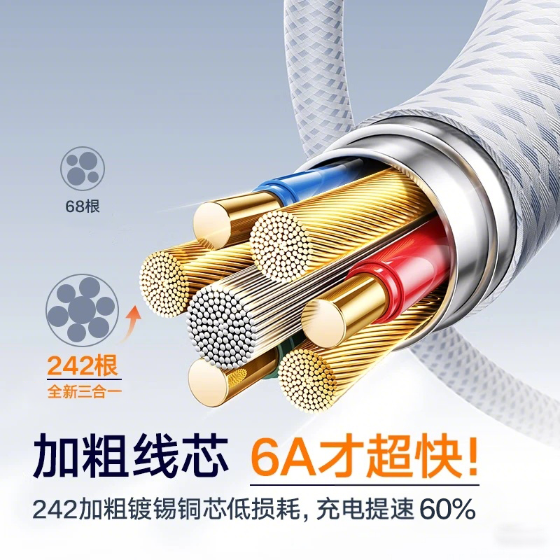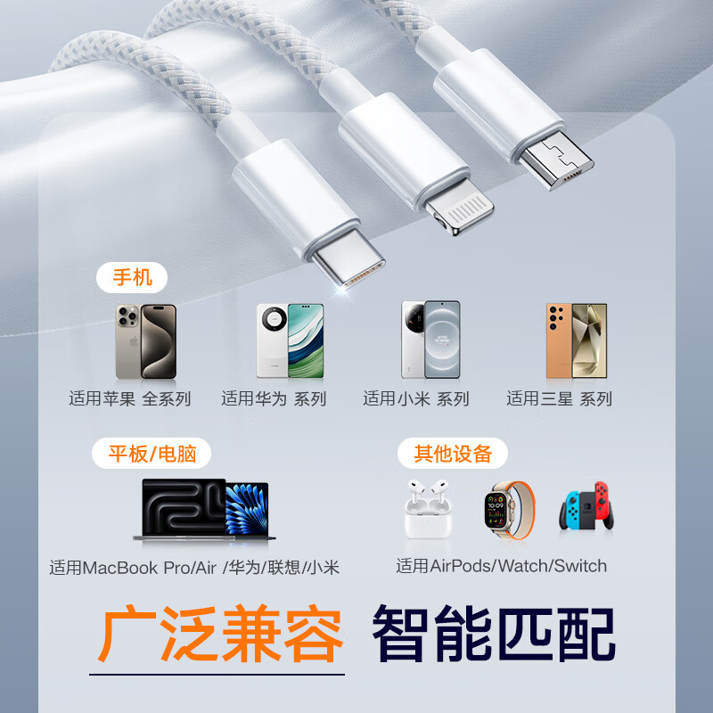 【国家3C认证】三合一线超级快充数据线充电头一拖三多功能多头适用苹果华为安卓车载三头编织充电线USB套装