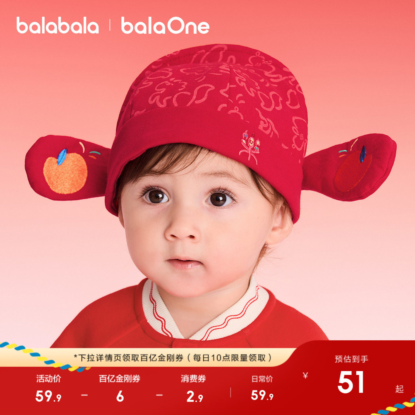 巴拉巴拉儿童帽子虎头帽男女童2026年冬装宝宝拜年新年喜庆保暖红