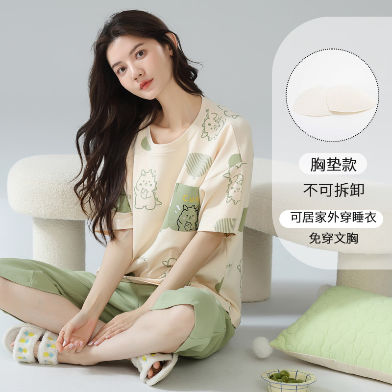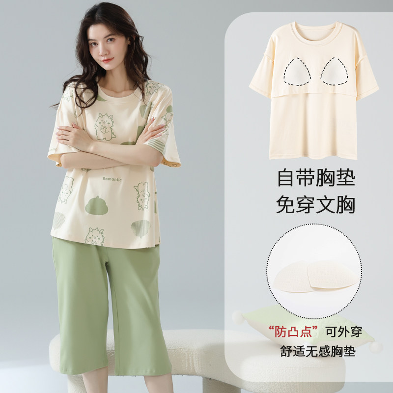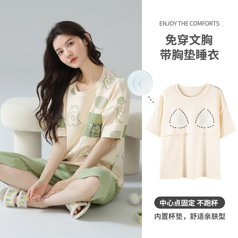 纯棉带胸垫睡衣女2025新款春秋季长袖套装可爱卡通韩版家居服秋冬