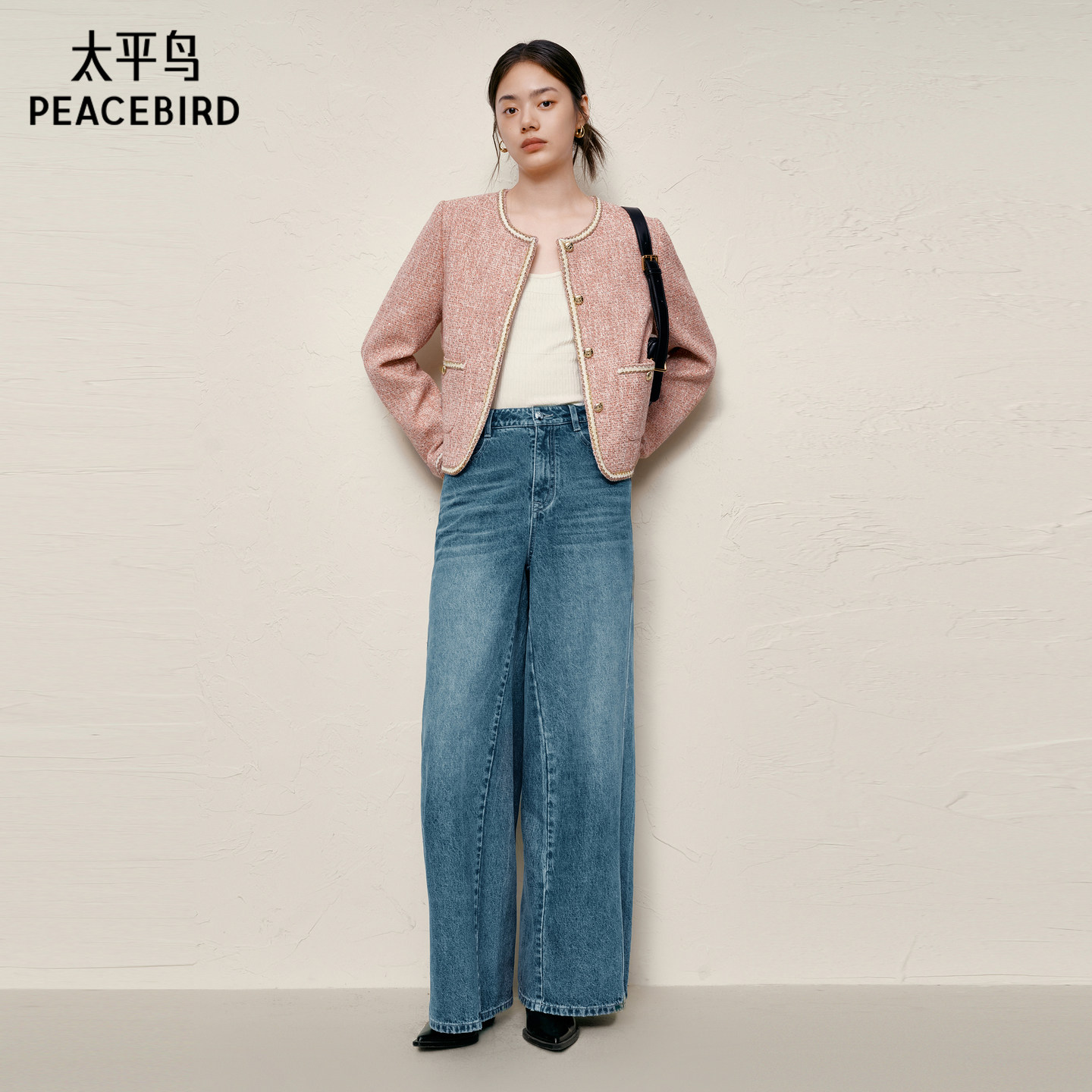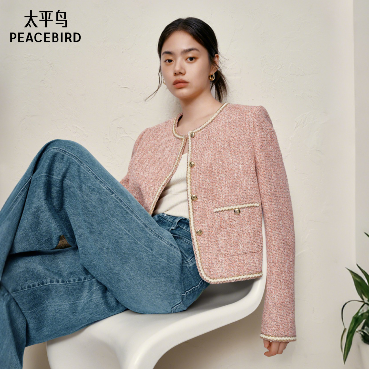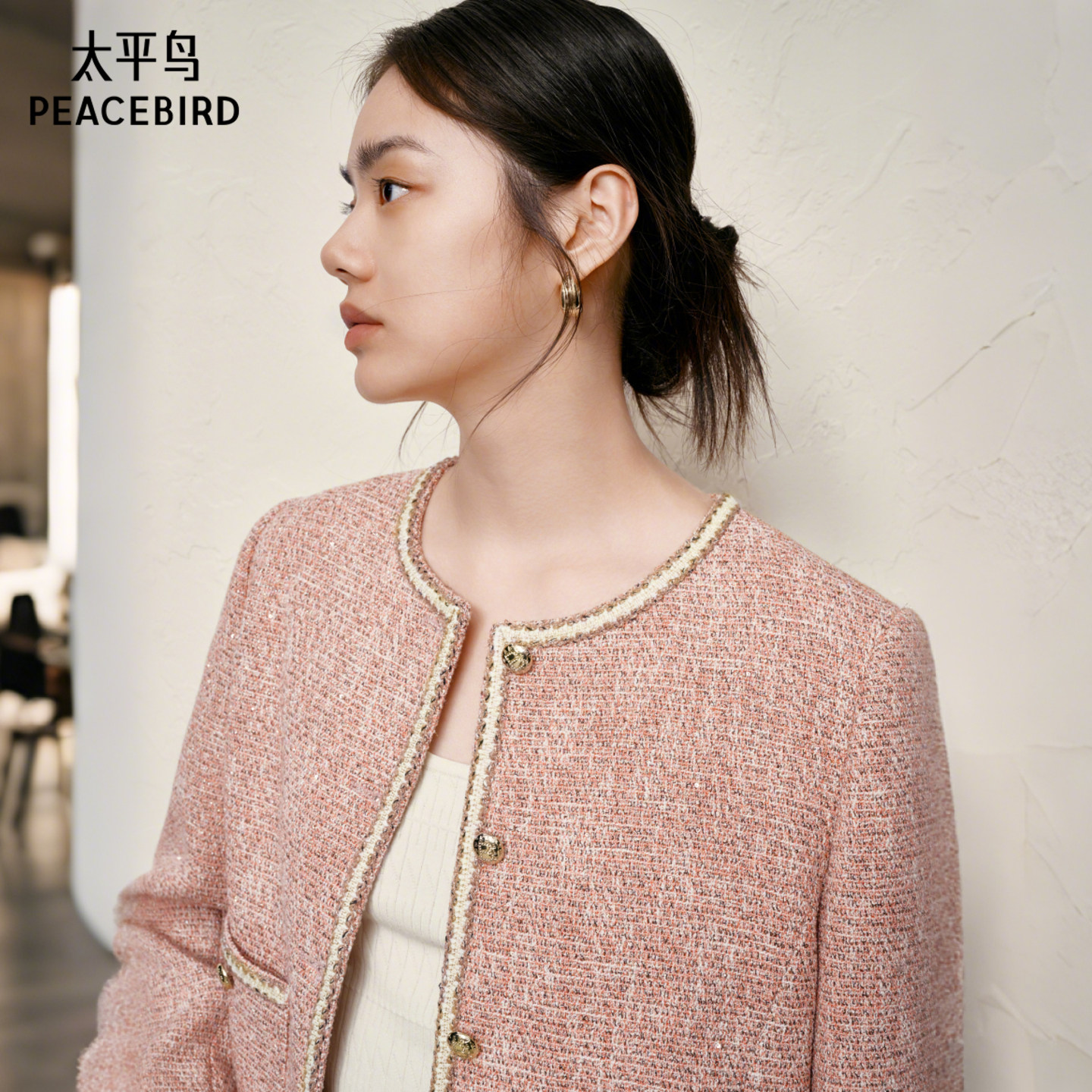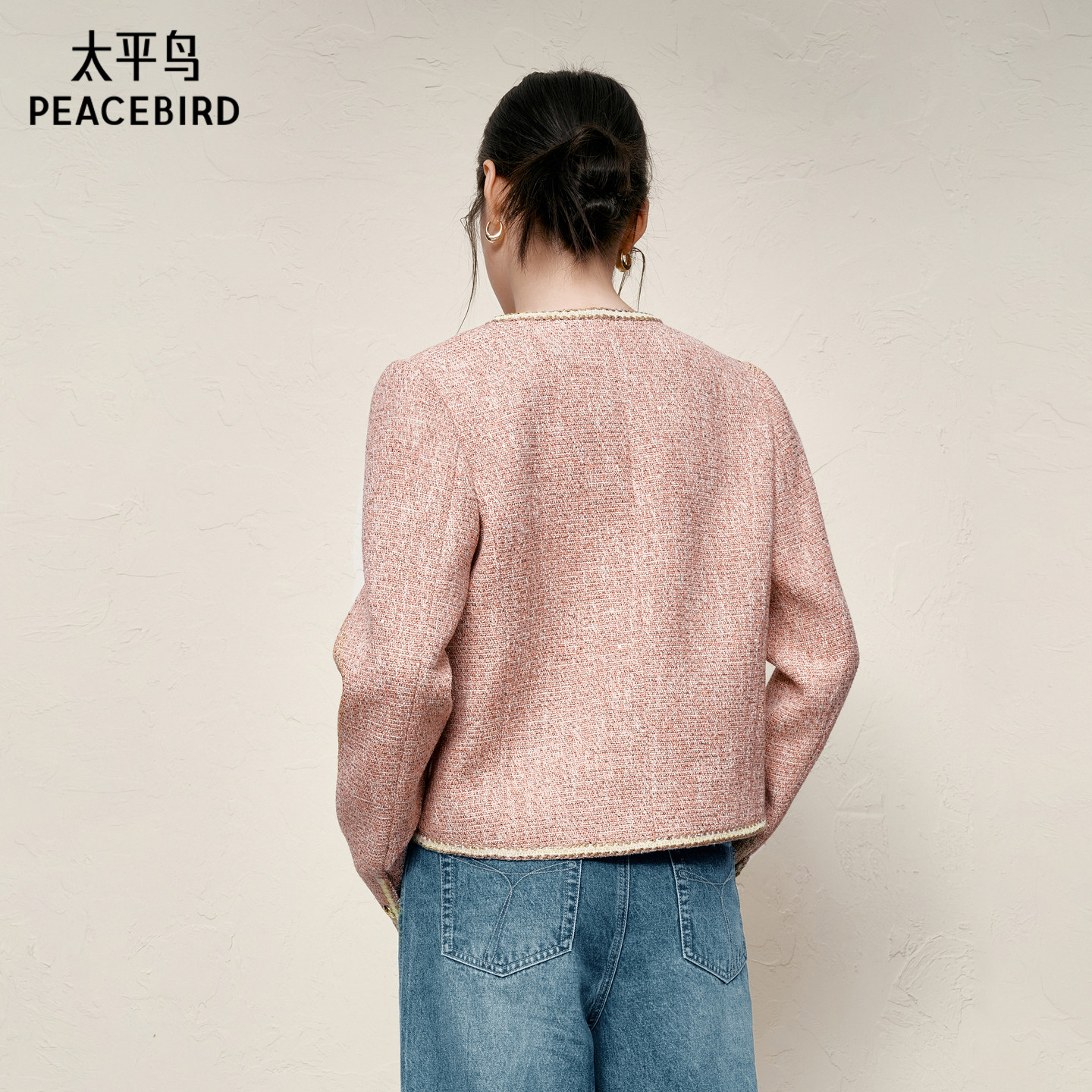 太平鸟粉色亮纱粗花呢小香风外套女高级感显瘦外套