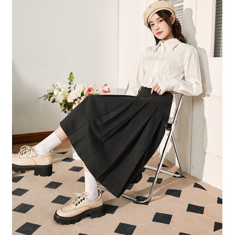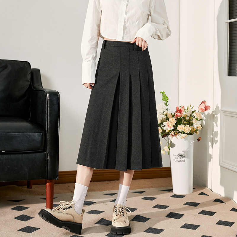 唐狮毛呢半身裙学院风秋冬新款女装高腰显瘦a字百褶长裙