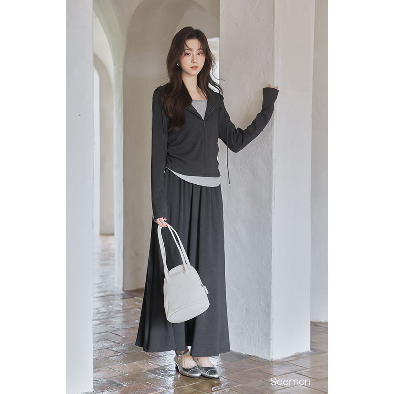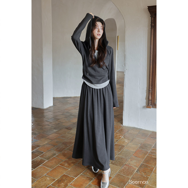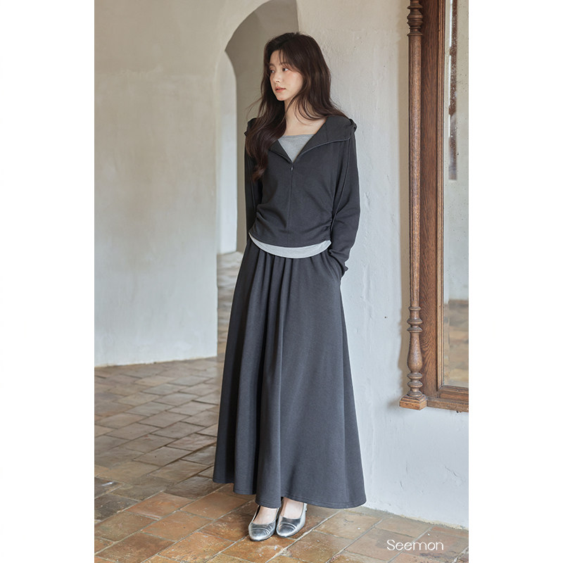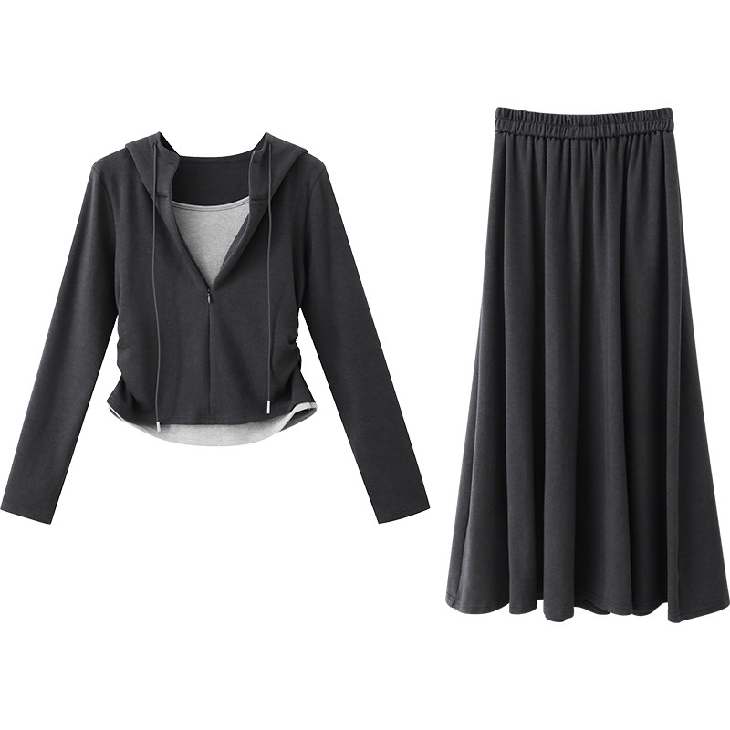 eihey诶嘿时尚简约宽松休闲小众连帽拉链外套长裙半身裙两件套女