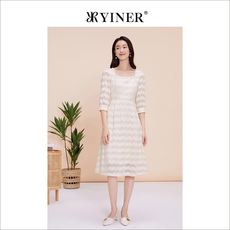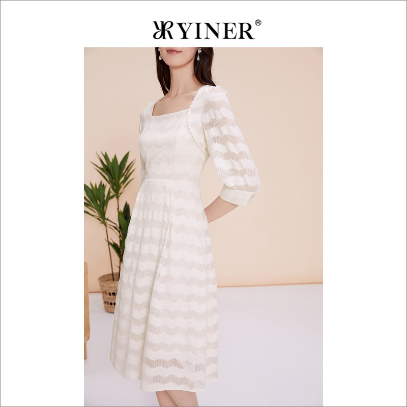 YINER音儿专选女装春季方领镂空茶歇公主袖连衣裙