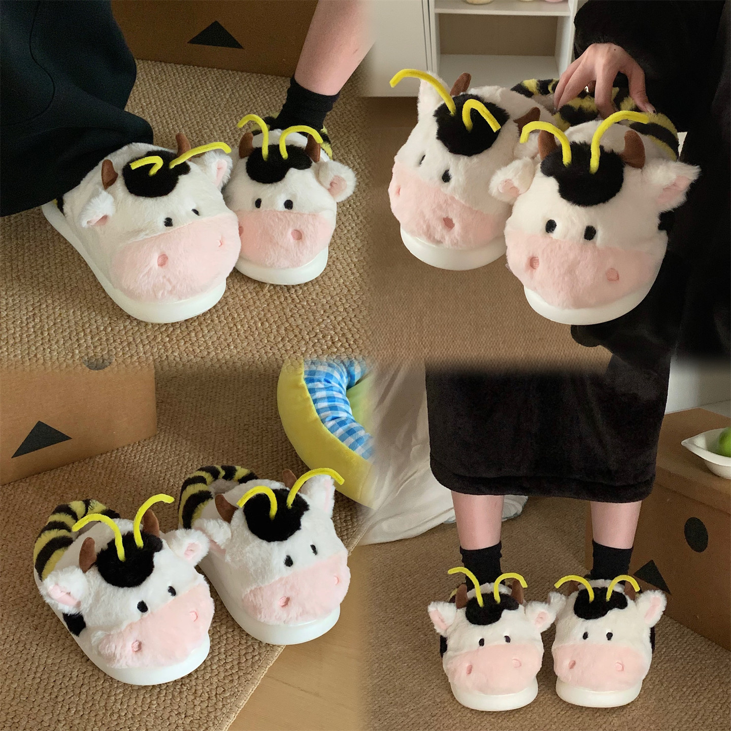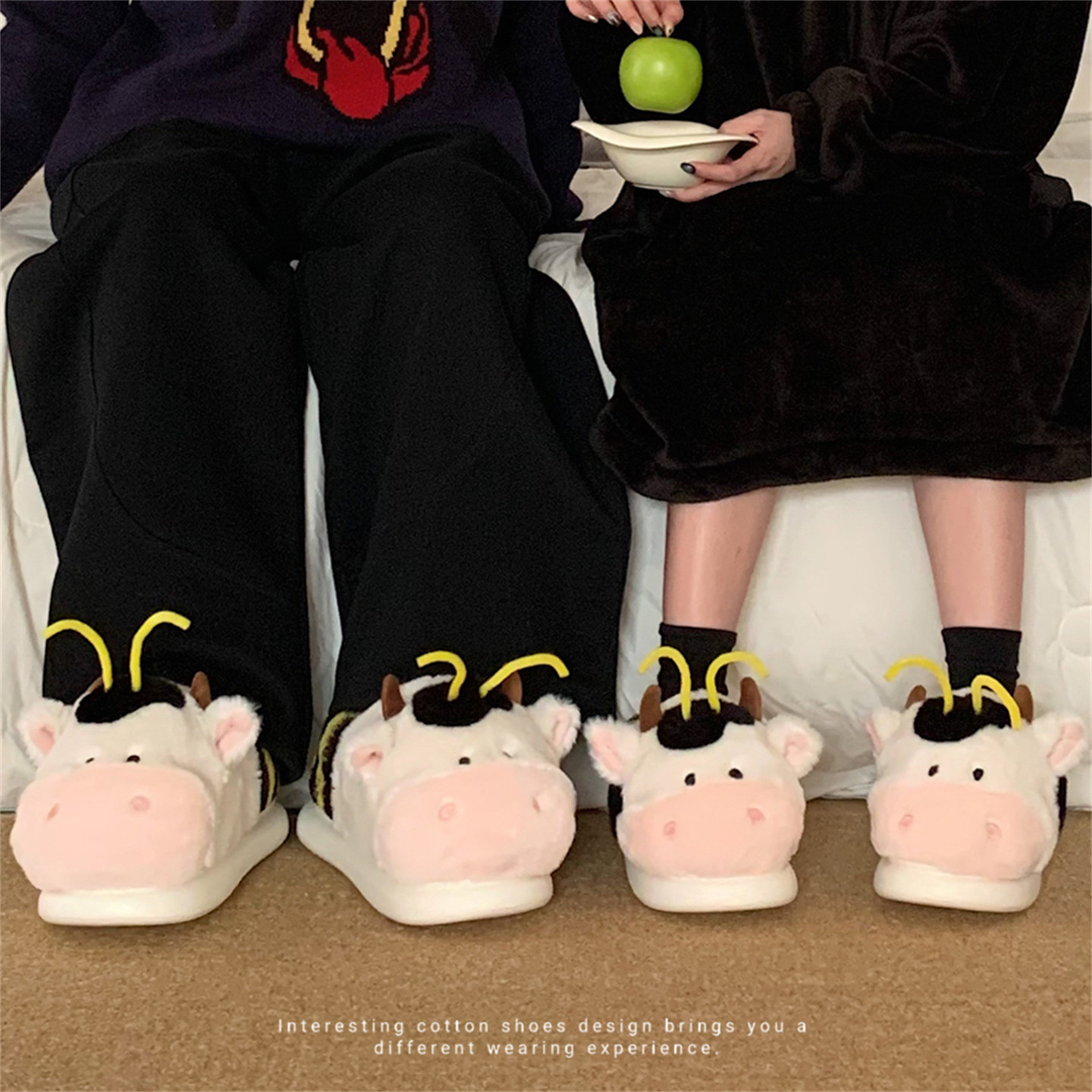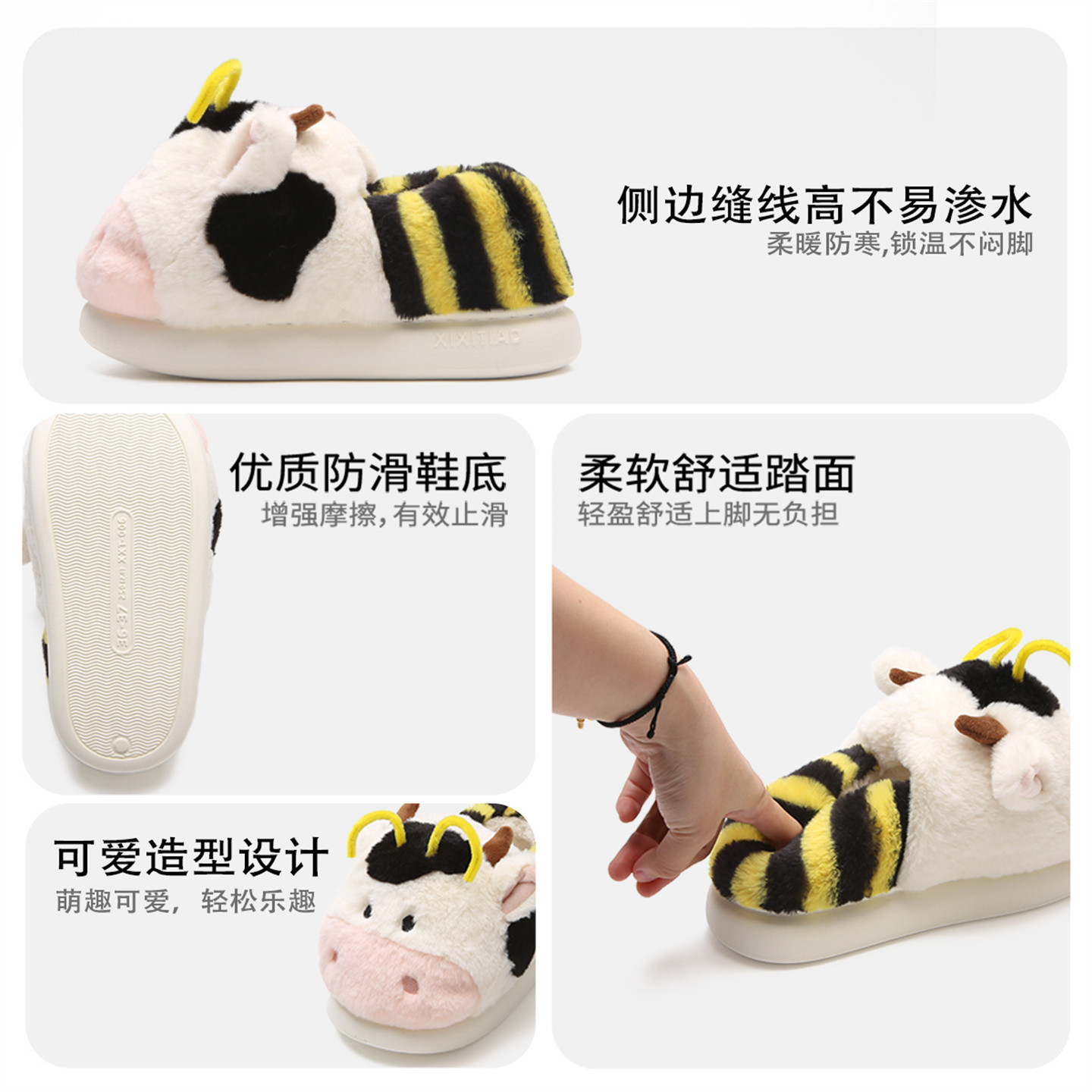 细细条 男女家用防滑冬季可爱包跟毛毛鞋趣味奶牛蜜蜂情侣棉拖鞋