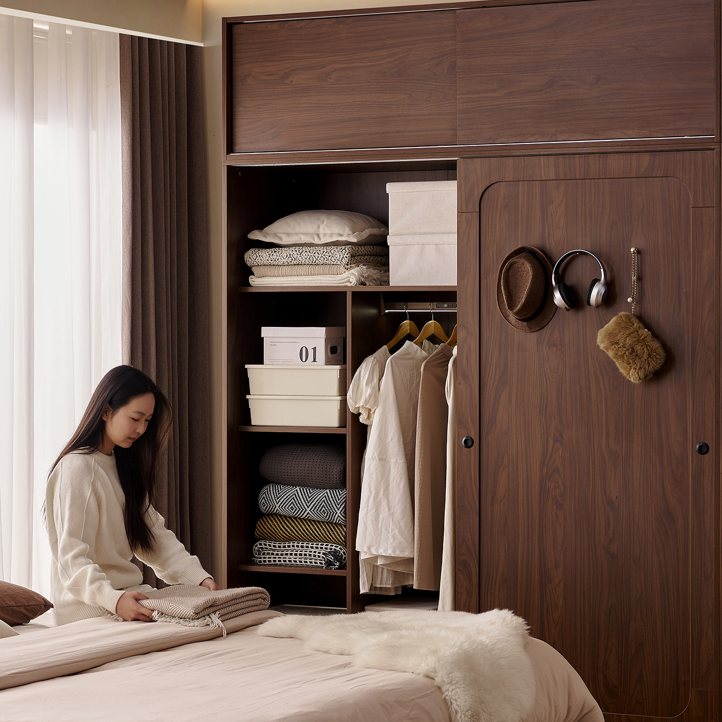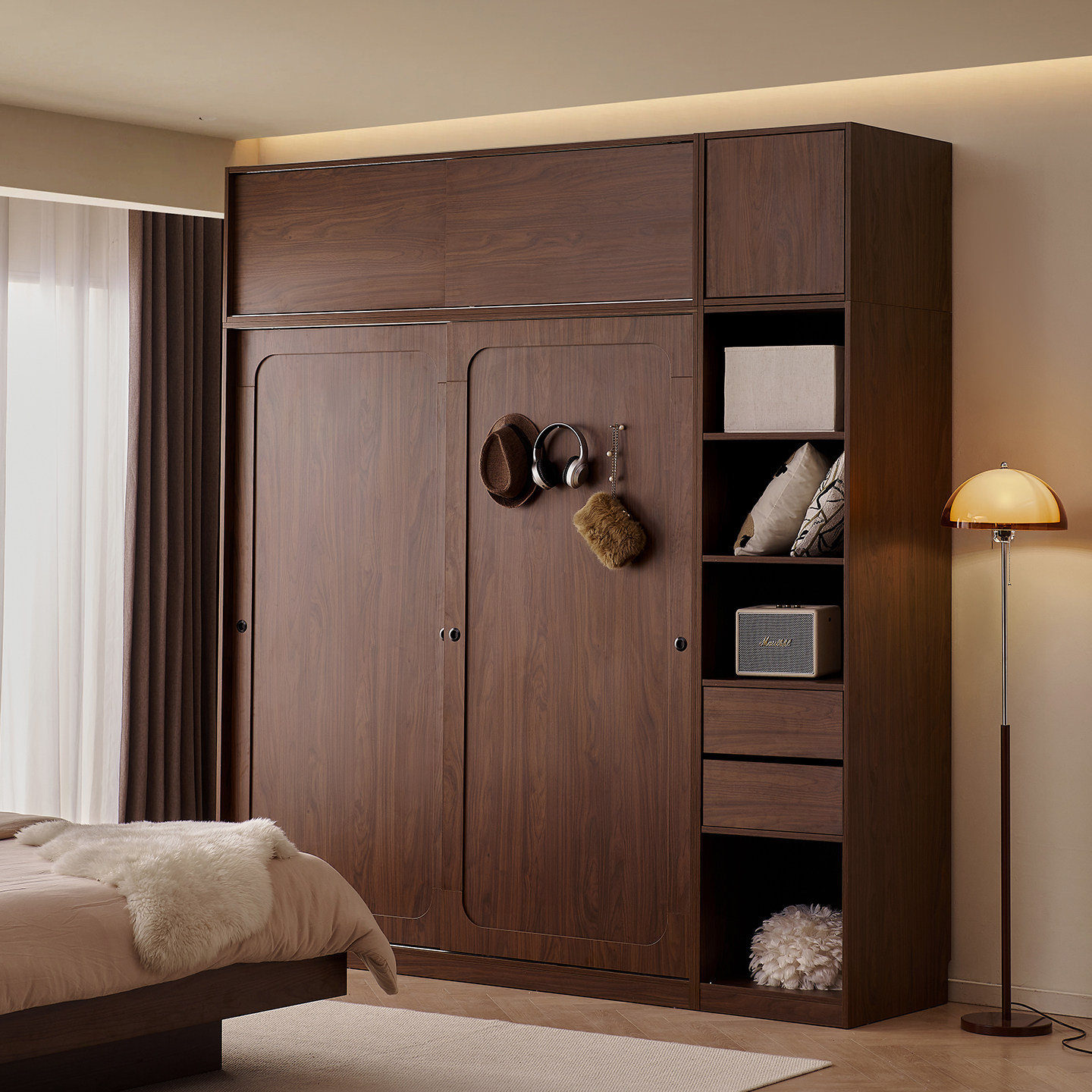 木兜家具山影衣柜黑胡桃色中古风复古推拉门衣柜卧室家用实木衣橱