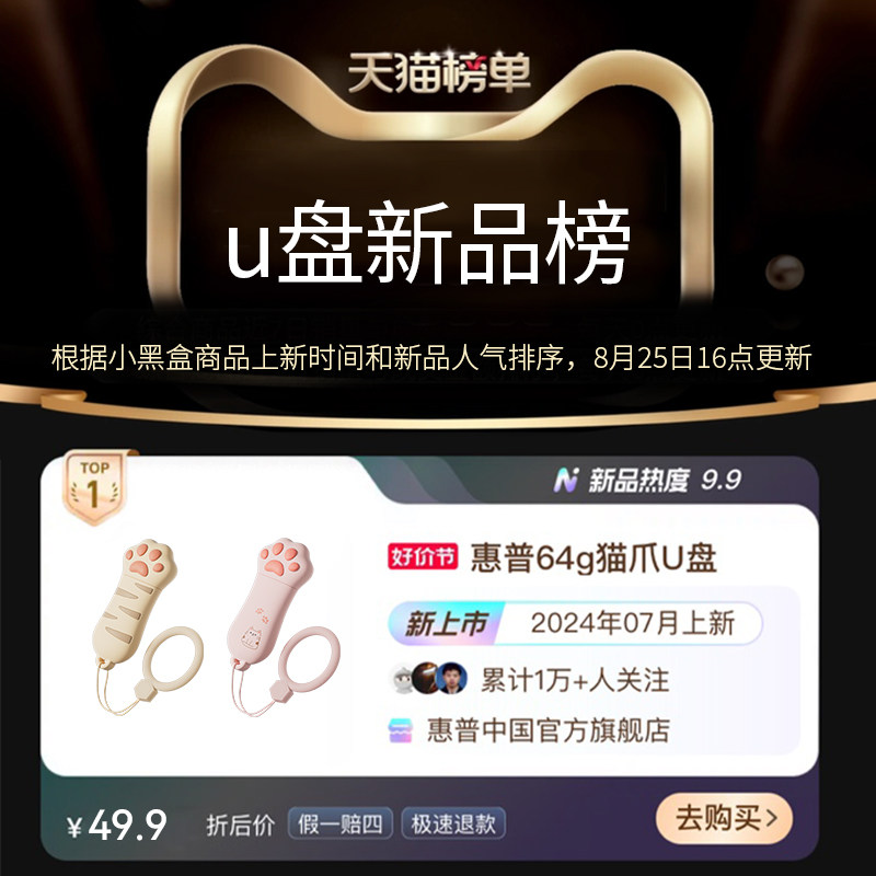 惠普64g大容量U盘 猫爪保护套 防水防摔防尘