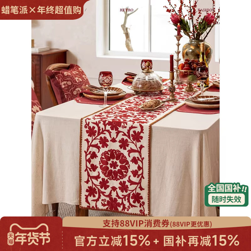 【国补再减15%】蜡笔派花开圆满桌旗红色节日桌布新婚乔迁茶旗