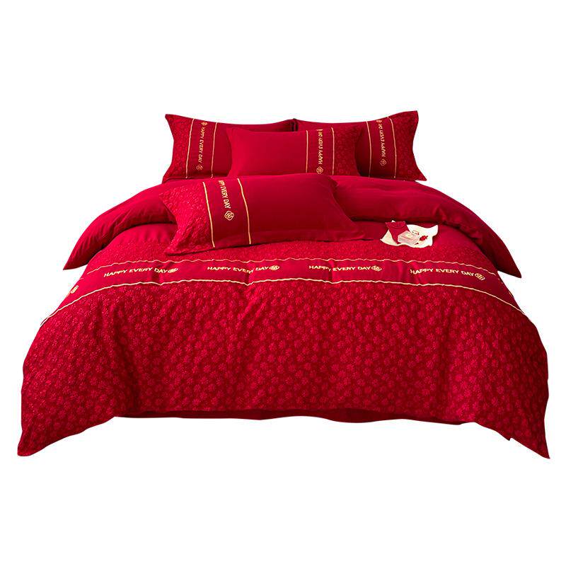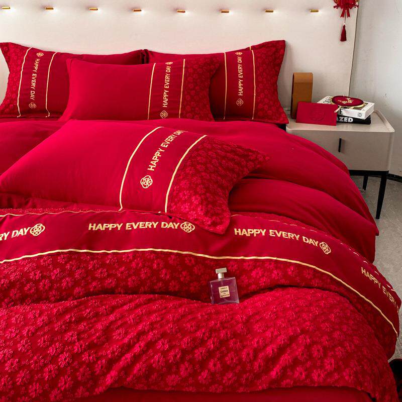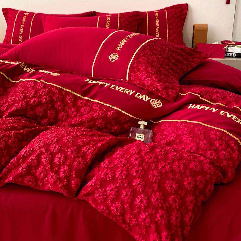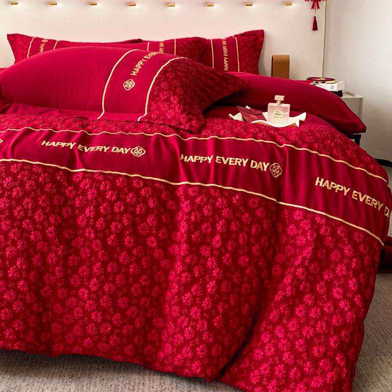 2024新款水洗磨毛刺绣大红婚庆四件套结婚床上用品喜庆床单被套