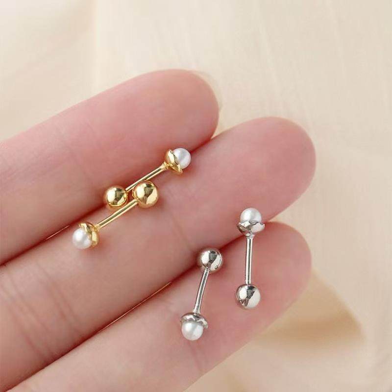 S925纯银珍珠螺丝球耳钉甜美气质小众简约百搭耳骨钉豆豆耳饰迷你
