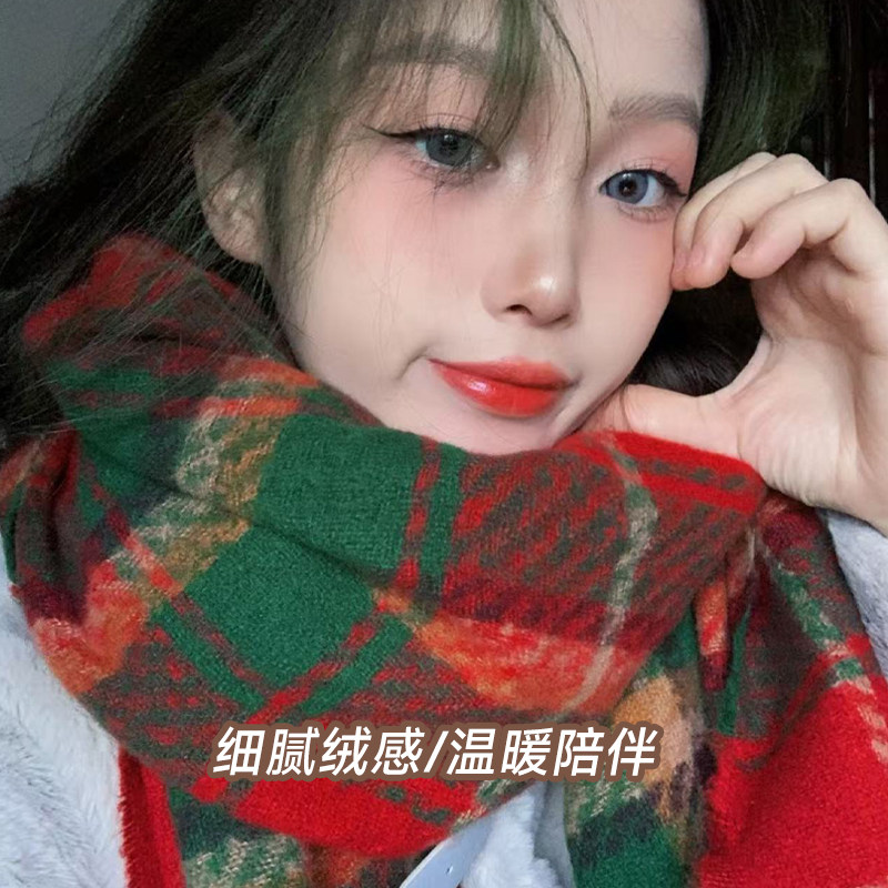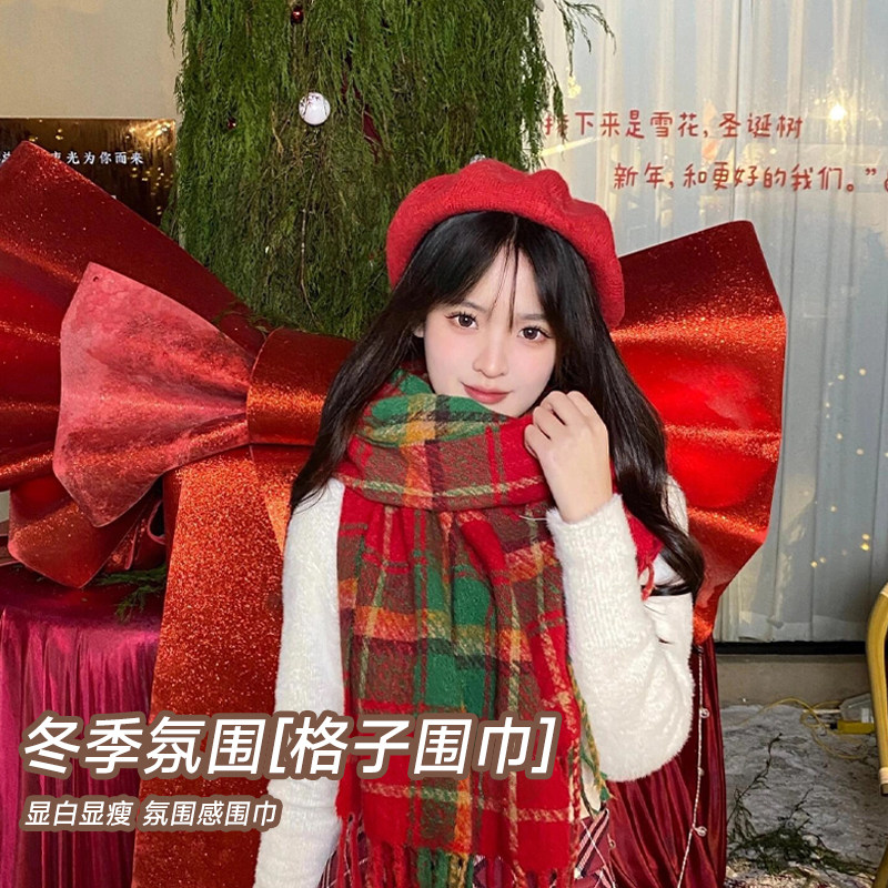 稻草人圣诞新年红色格子围巾女冬季韩版氛围感加厚披肩保暖围脖男