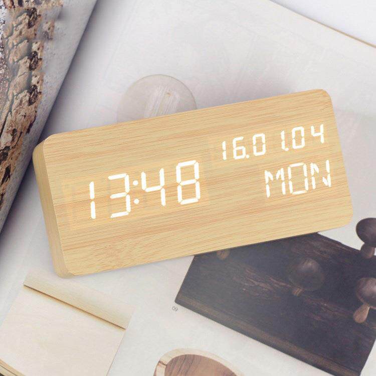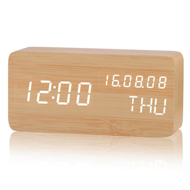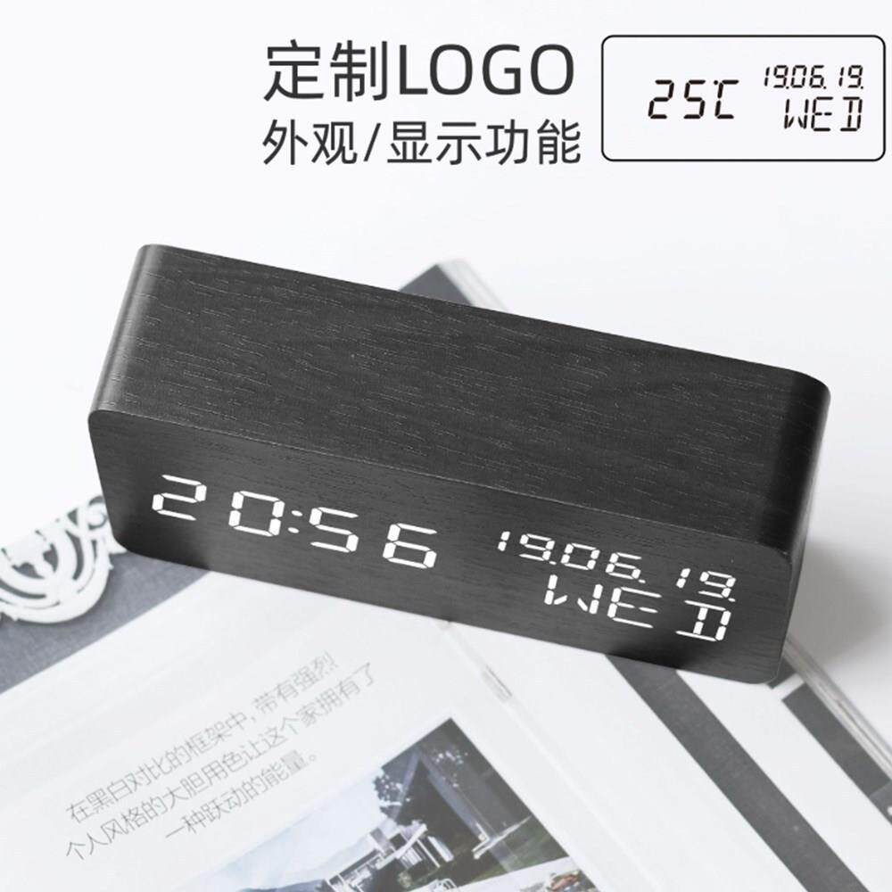 LED创意电子钟表夜光静音闹钟年月日星期学生床头木质木头座台钟