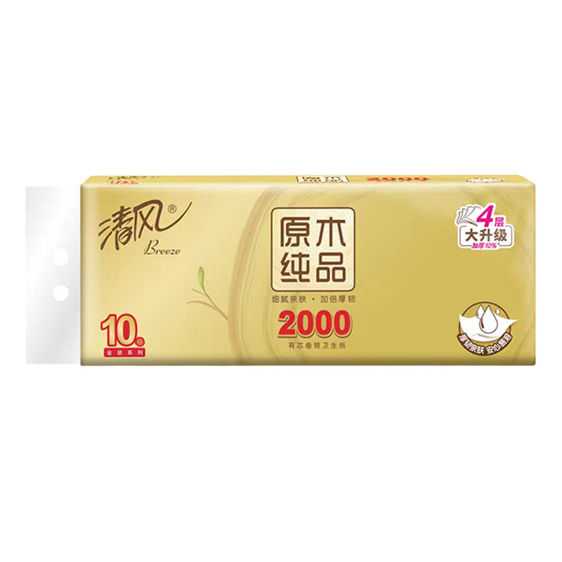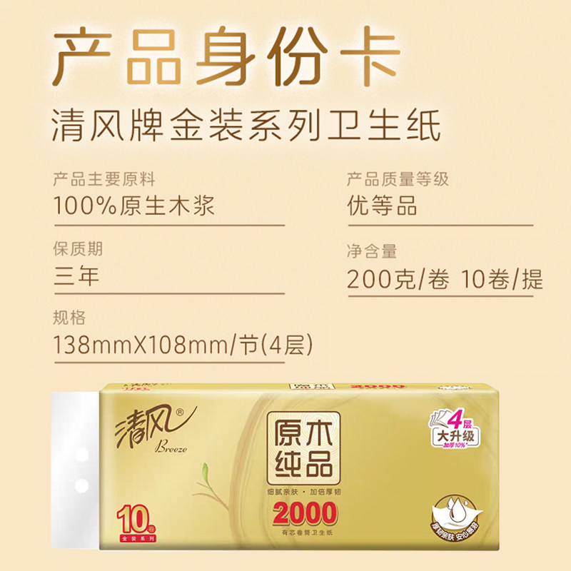 清风有芯卷纸金装原木纯品200克10卷家用实惠装卷筒纸木浆原生