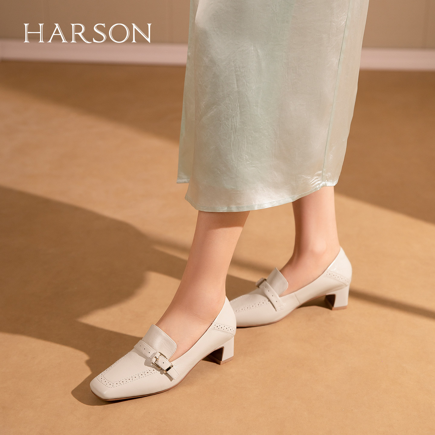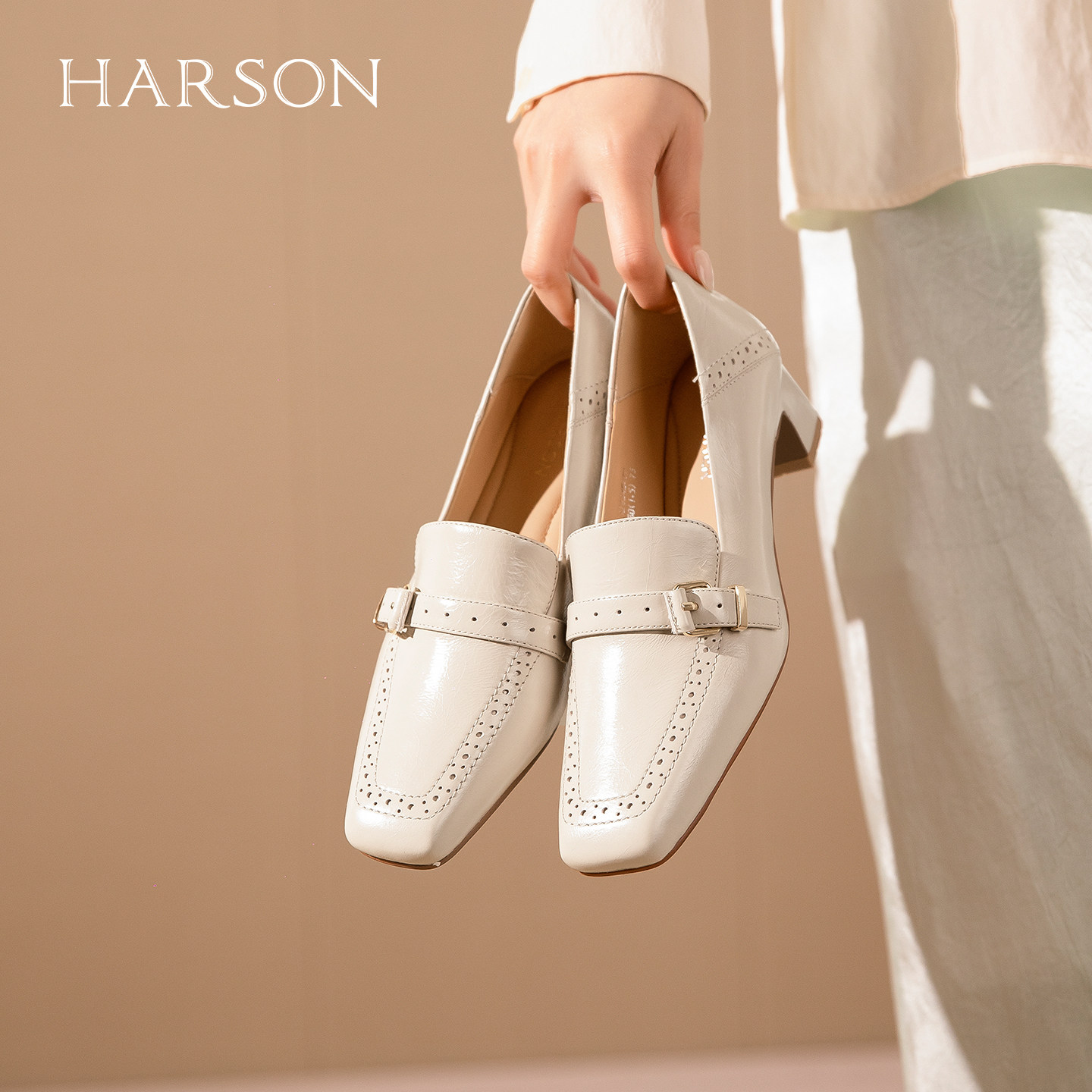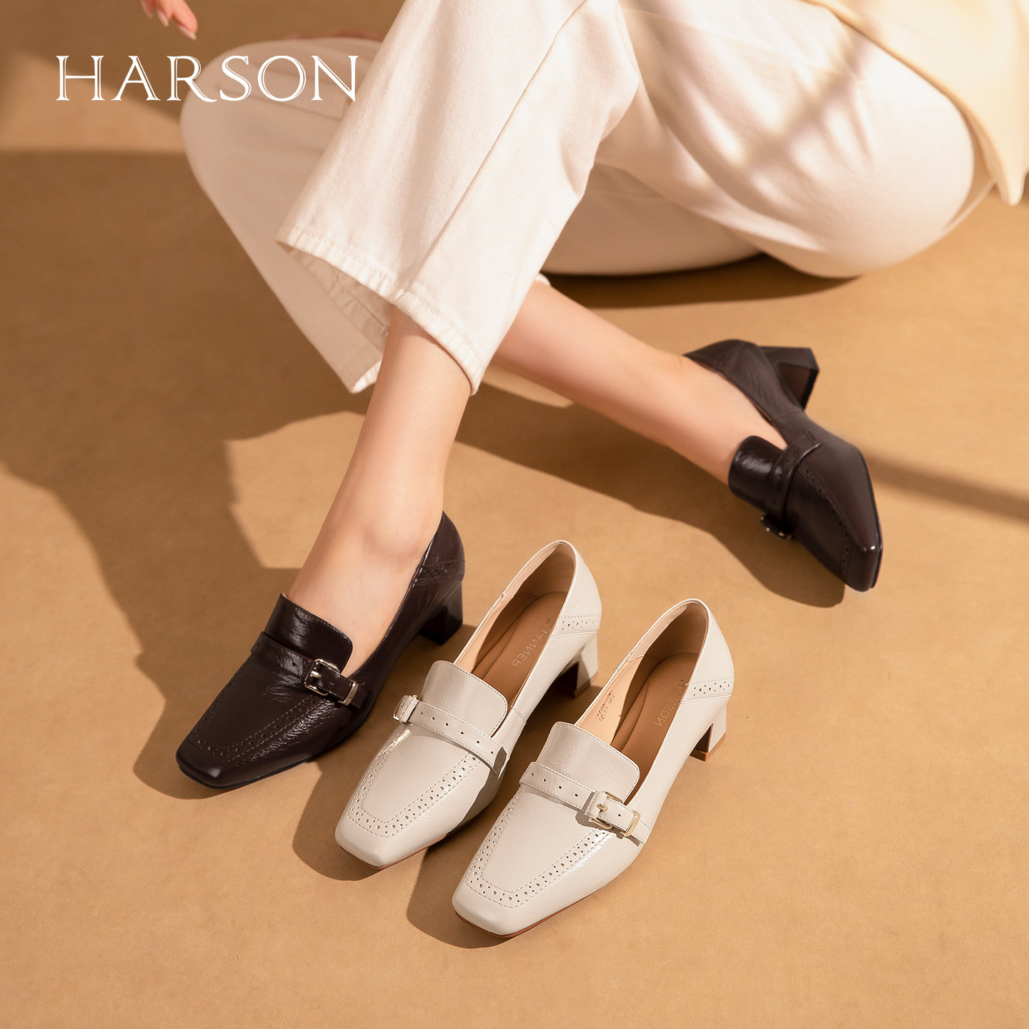 哈森复古甜美风浅口单鞋方头粗跟中跟舒适女鞋2026新款HWS260111
